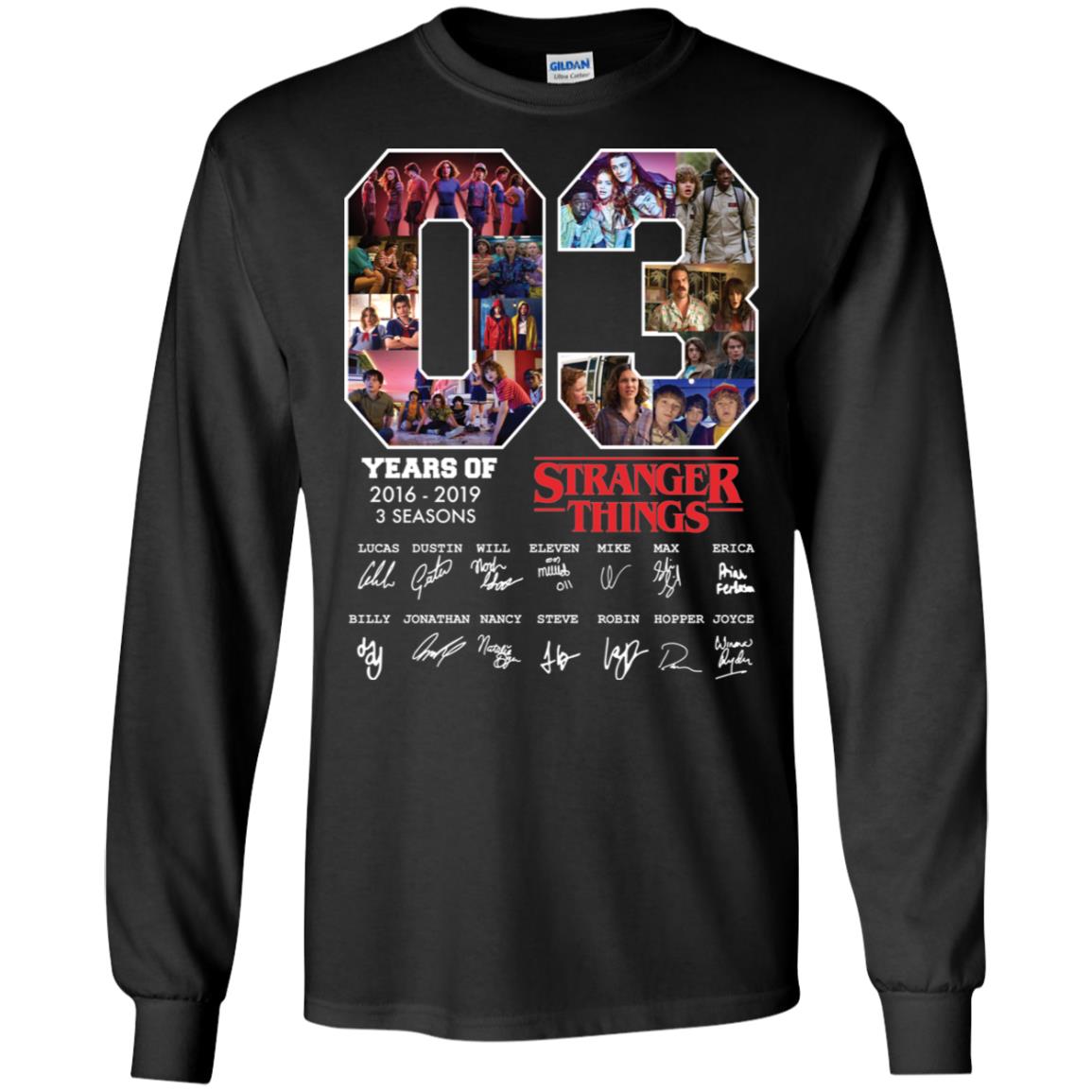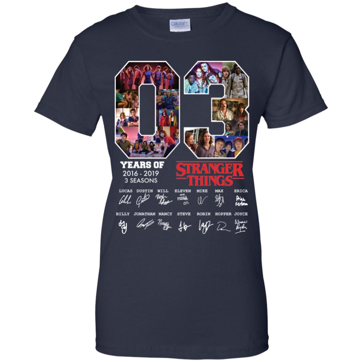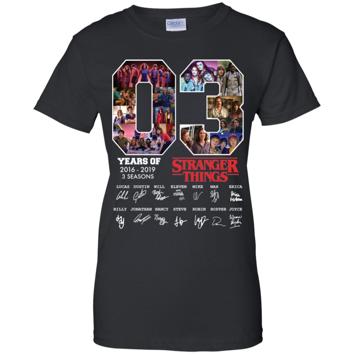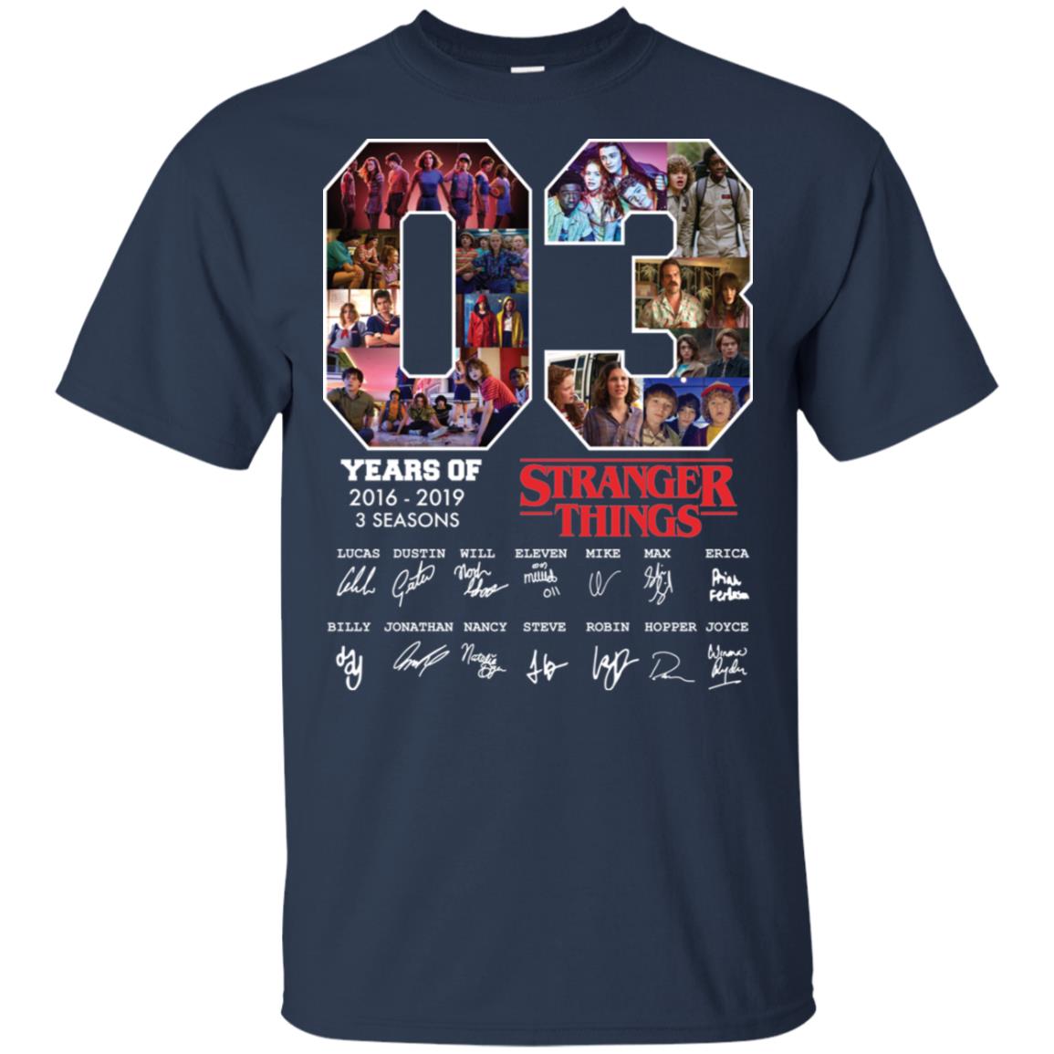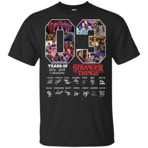 The period between 2016 and 2019 was pivotal for the show. It began with the disappearance of Will Byers and the arrival of Eleven in Season 1, plunging viewers into the thrilling supernatural mystery. Season 2 expanded the universe, introducing new characters and deeper threats lurking beneath Hawkins. Season 3 brought mall adventures, summer vibes, and escalated danger with the Mind Flayer. Each season contributed significantly to the show’s lore and global phenomenon status. The 03 Years of Stranger Things 2016-2019 3 Seasons Signature Shirt encapsulates the spirit and impact of these crucial early chapters.