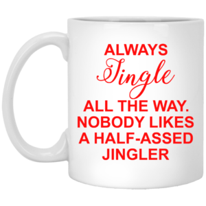 The holiday season is a time for joy, celebration, and, for many, a healthy dose of festive cheer. If you’re someone who believes in fully committing to the spirit of Christmas, then the “Always Jingle All The Way Nobody Likes A Half Assed Jingler Coffee Mug” is the perfect way to start your day or enjoy a warm beverage. This unique Coffee Mug makes a bold statement that resonates with anyone who goes all-in for the holidays.
