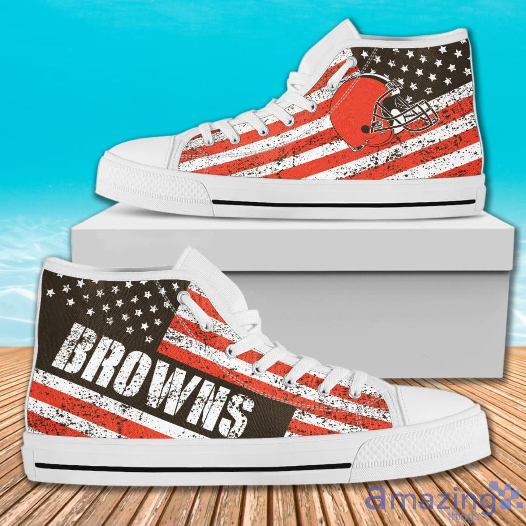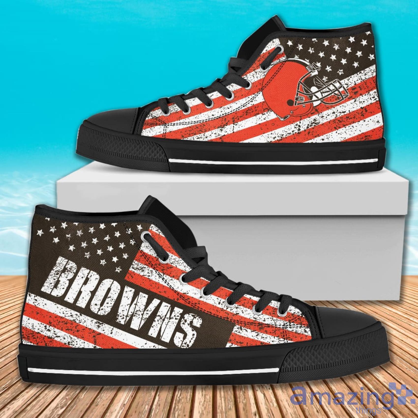 Featuring a unique design that combines the iconic American flag with the bold colors of the Cleveland Browns, these high-top shoes are a must-have for any die-hard fan. The vintage style adds a touch of nostalgia to your wardrobe, while the italic font of the flag creates a modern and trendy look.