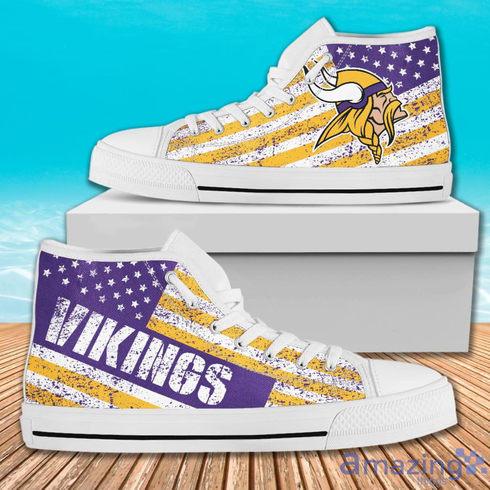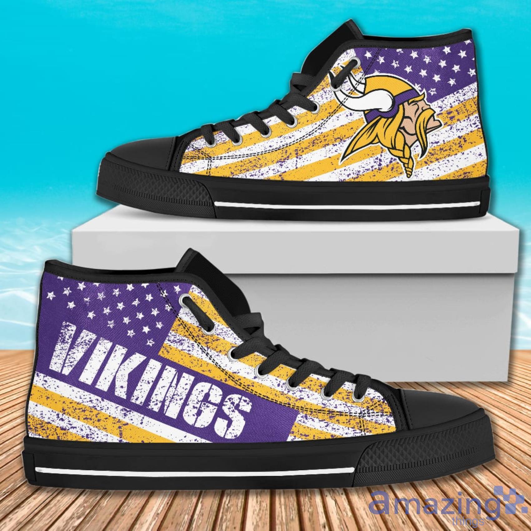 Crafted with premium materials, our high top shoes are designed to last and keep your feet comfortable all day long. The bold and stylish design features the iconic Minnesota Vikings logo and the American flag in an italic vintage style, making it the perfect accessory to show off your team spirit and patriotism.