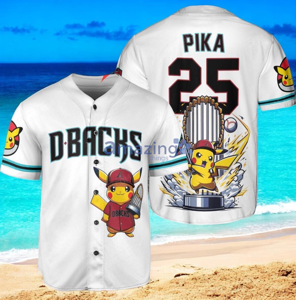 Show off your love for both the Arizona Diamondbacks and Pikachu with our custom baseball jersey shirt! This white shirt features a unique design combining the iconic Diamondbacks logo with the beloved Pokemon character Pikachu, complete with a trophy to add an extra touch of charm. Perfect for any baseball fan or Pokemon lover, this jersey is sure to turn heads wherever you go. Don’t miss out on this one-of-a-kind piece that combines two of your favorite things in one stylish shirt. Order yours today and add a
