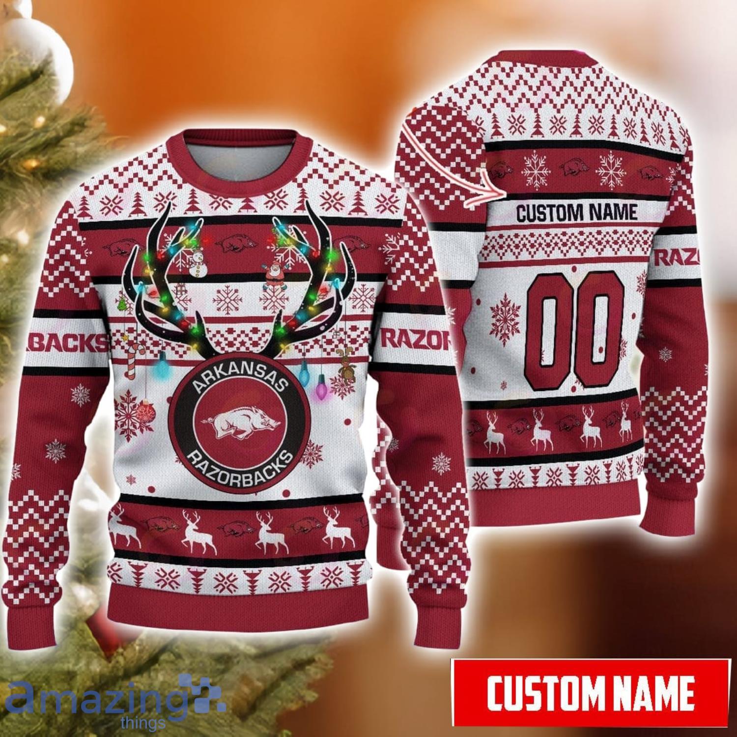 Arkansas Razorbacks Reindeer Pattern Special Custom Name And Number Ugly Christmas Sweater NCAA Fans Gifft