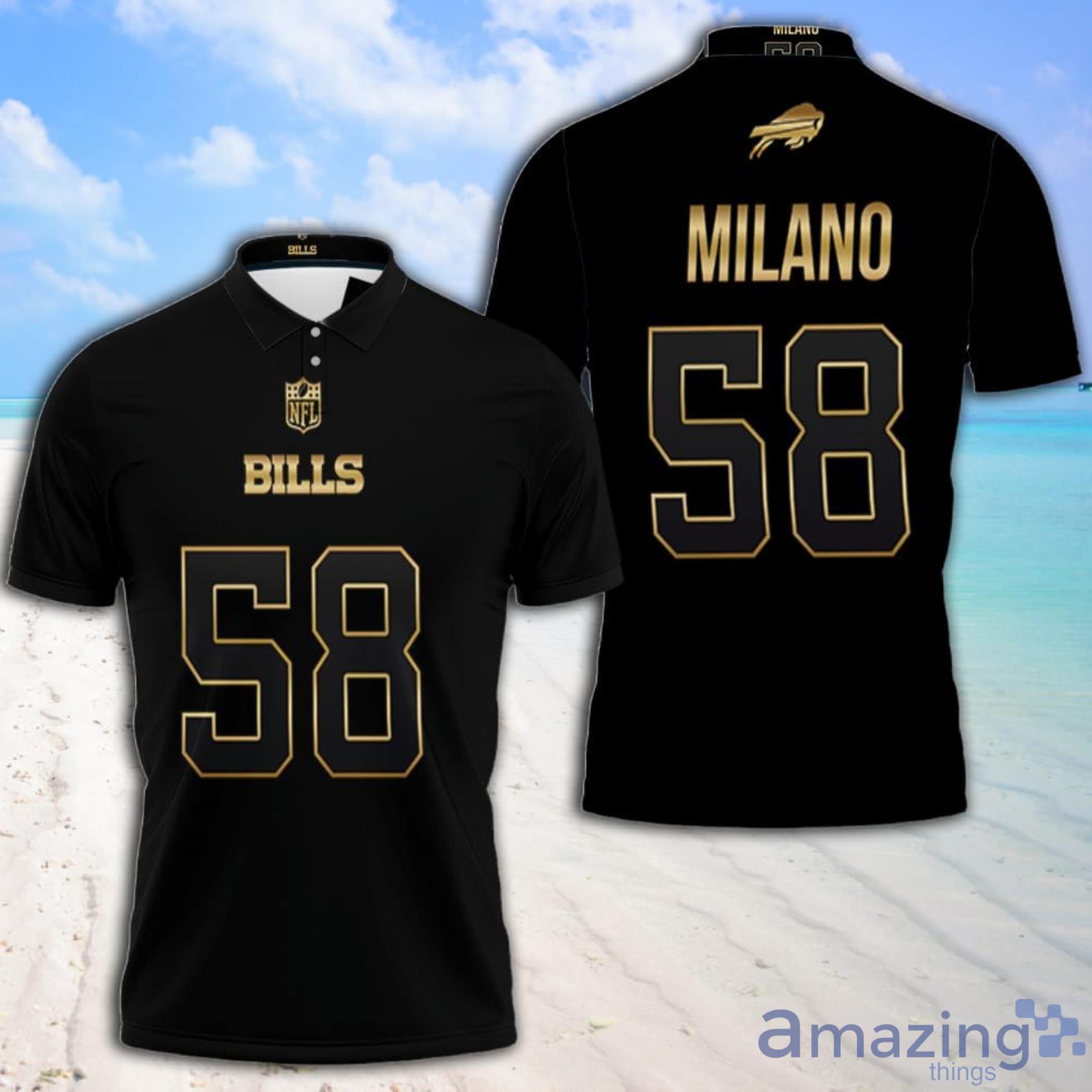Crafted from high-quality materials, this limited edition polo shirt features the iconic Buffalo Bills logo on the front, alongside the number 58 in honor of the team’s star linebacker, Matt Milano. The black and gold color scheme is bold and eye-catching, making it the perfect choice for game day or any other occasion where you want to show your team spirit.