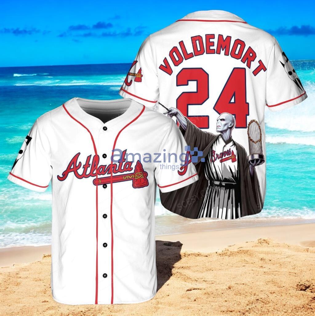 Show your love for the Atlanta Braves and Harry Potter with this unique custom baseball jersey shirt featuring Lord Voldemort holding a trophy. This white jersey is perfect for any fan looking to stand out in the crowd. Made with high-quality materials, this shirt is not only stylish but also comfortable to wear all day long. Don’t miss out on this limited edition collaboration – get your Atlanta Braves x Lord Voldemort Harry Potter with Trophy Custom Baseball Jersey Shirt today!