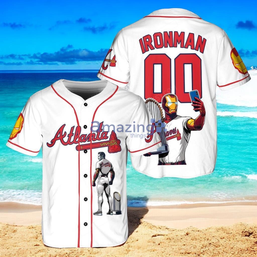 Atlanta Braves x Marvel Iron Man Tony Stark with Trophy Custom Baseball Jersey Shirt White Information: