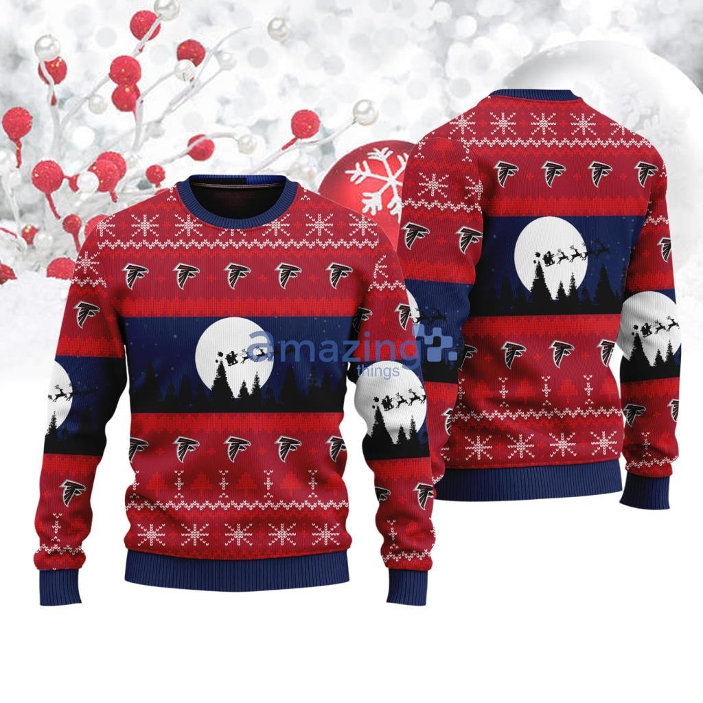 This All Over Print (AOP) sweater boasts a vibrant and eye-catching design. The design features a repeating pattern incorporating the Atlanta Falcons logo, team colors (red, black, and silver), and classic Christmas motifs such as snowflakes, reindeer, and Christmas trees. The composition is carefully arranged to create a balanced and festive look, making it a standout piece at any holiday gathering.