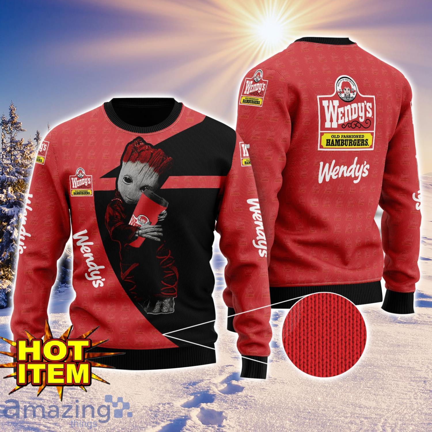 Get into the holiday spirit with this adorable Baby Groot Hug Wendy’s Ugly Christmas 3D Sweater! Featuring a fun all-over print design, this cozy sweater is perfect for spreading Christmas cheer. The cute Baby Groot hug adds a touch of whimsy to your festive wardrobe. Stand out at any holiday party with this unique and eye-catching sweater. Don’t miss your chance to rock this one-of-a-kind Christmas sweater!