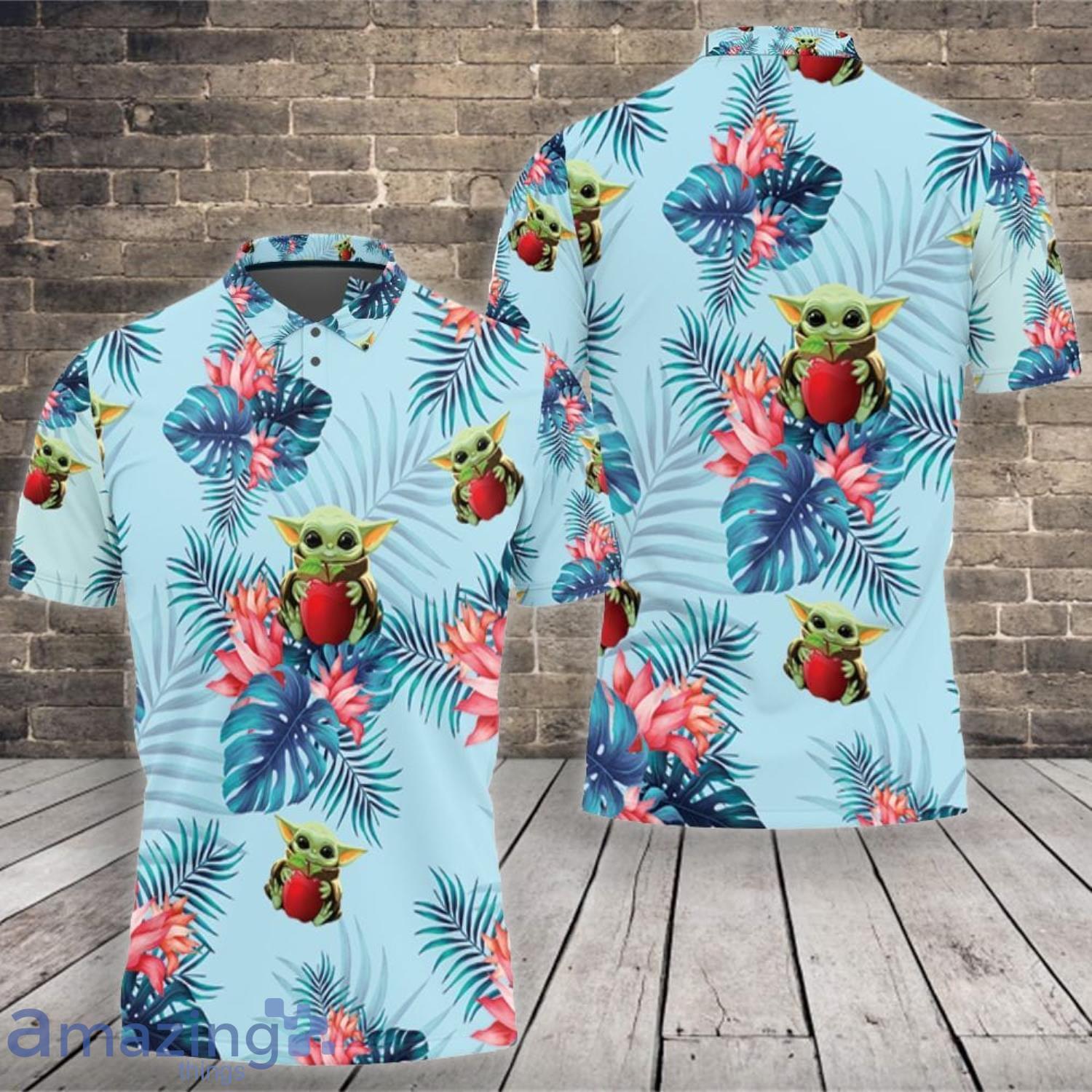So, if you’re a Baby Yoda lover who wants to show off your love for the character in a stylish and unique way, then the Baby Yoda Lover Baby Yoda Hugging Apples Seamless Tropical Colorful Flowers Blue Leaves On Blue Polo Shirt is the perfect choice for you. Don’t miss out on this adorable and trendy piece of clothing – get yours today!