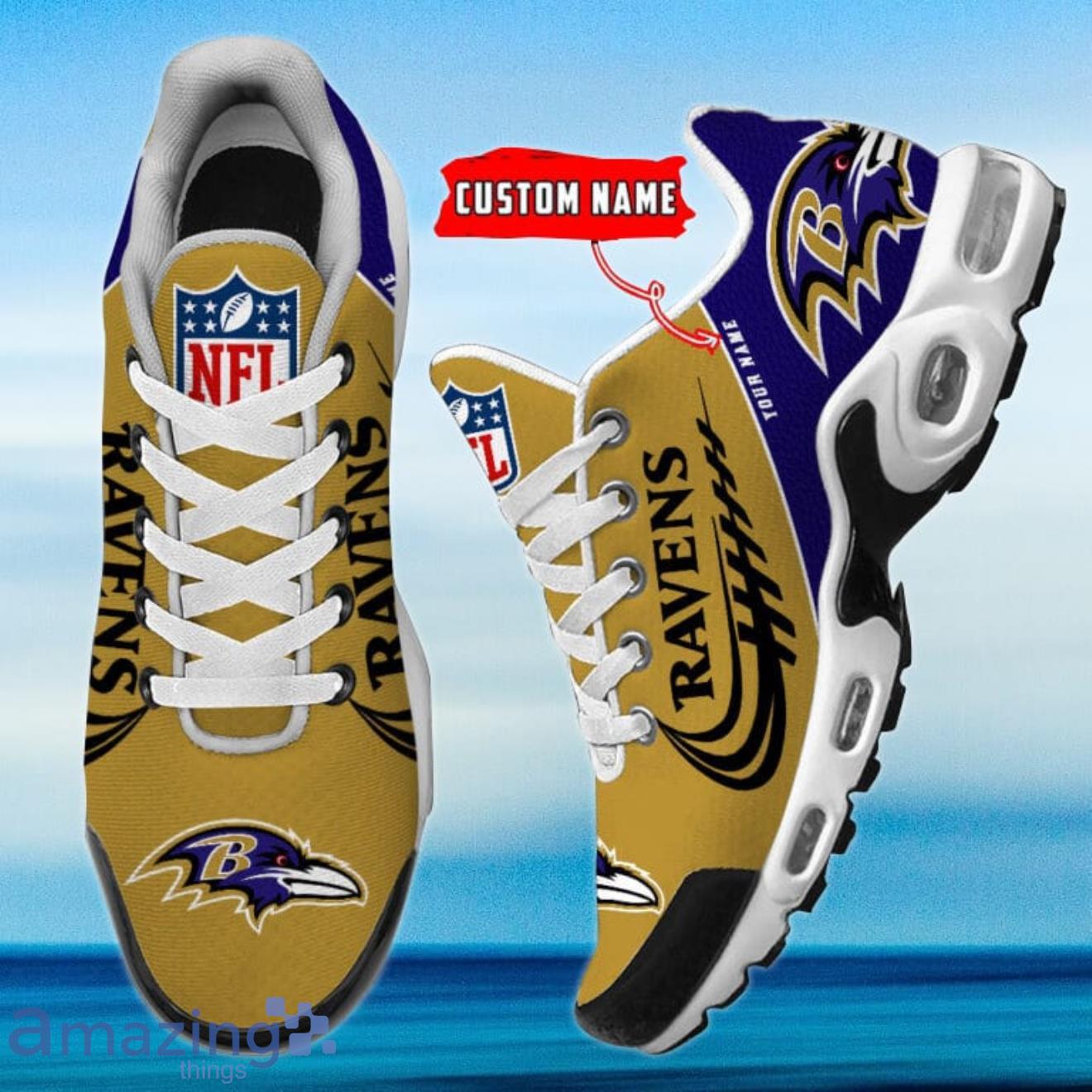 But what truly sets these shoes apart is the customization option. You can personalize them with your own name, making them a one-of-a-kind accessory that showcases your unwavering support for the Baltimore Ravens. Imagine the envy of fellow fans as you sport these unique shoes, proudly displaying your name alongside the iconic team logo.
