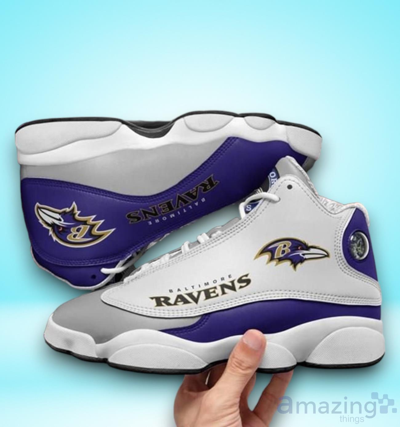 The Baltimore Ravens NFL Air Jordan 13 Sneaker Shoes are not just any ordinary footwear – they showcase your unwavering loyalty to the Ravens. The official team colors and logo are tastefully incorporated into the design, making these shoes a must-have for any true Ravens fan.