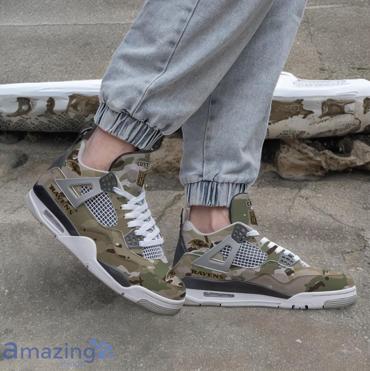 Stand out from the crowd with the striking Baltimore Ravens NFL Design Camo Air Jordan 4 Custom Name sneakers. These one-of-a-kind shoes are perfect for any fan looking to showcase their team pride in style. The bold camo design and customizable name feature make these shoes a unique and personalized addition to your collection. Step up your game day look and show off your love for the Baltimore Ravens with these exclusive kicks. Order yours today and elevate your fan gear to the next level!