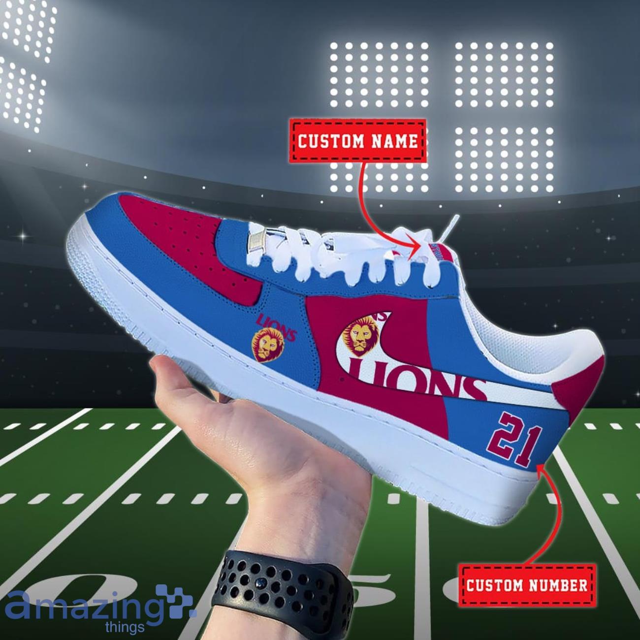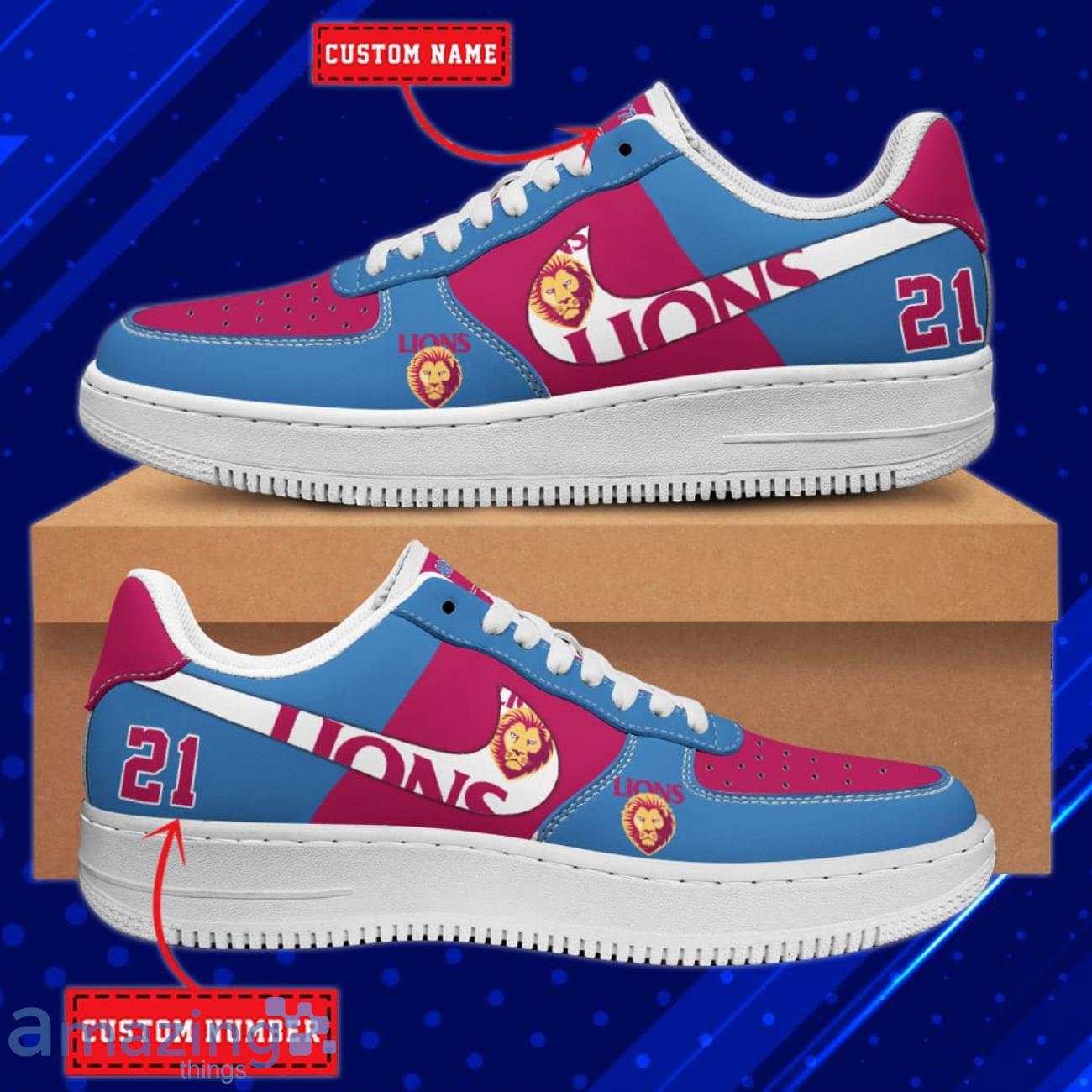 Crafted with the utmost care and precision, our Air Force shoes are made to provide exceptional comfort and durability. The sleek design features the iconic Brisbane Lions AFL logo, adding a touch of team spirit to your every step. But what truly makes these shoes special is the option to personalize them with your own name or any text of your choice.
