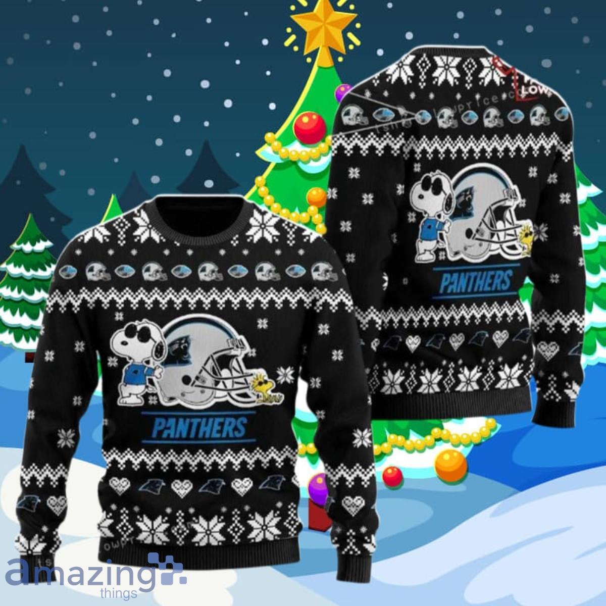 Featuring a delightful design that combines the iconic Carolina Panthers logo with everyone’s favorite beagle, Snoopy, this sweater is a true conversation starter. The football helmet pattern adds a playful touch, making it a must-have for any football enthusiast during the holiday season.