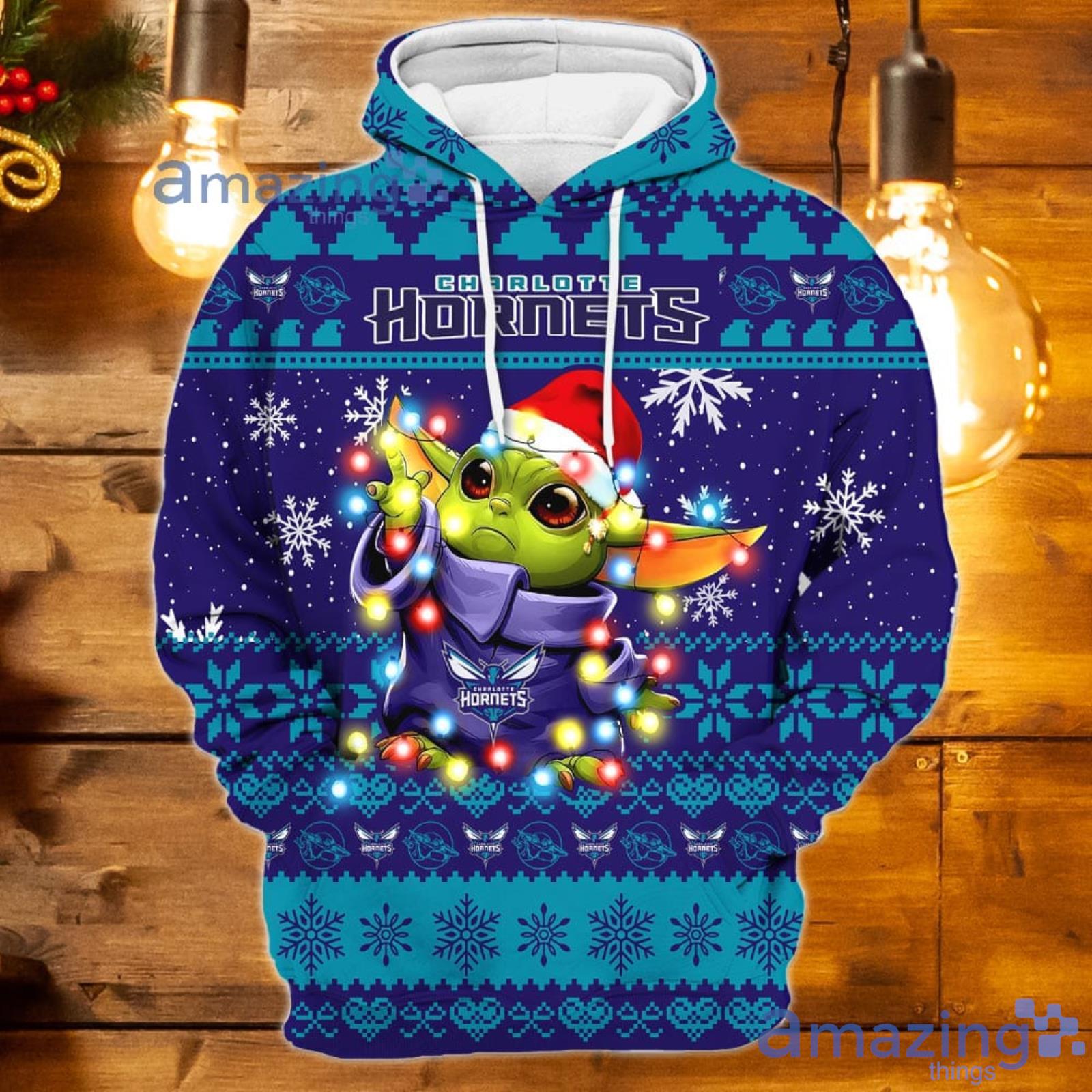 Get ready to show off your dual fandom with this Charlotte Hornets Baby Yoda Star Wars Lover 3D Hoodie. Order yours today and embrace the holiday spirit in style!