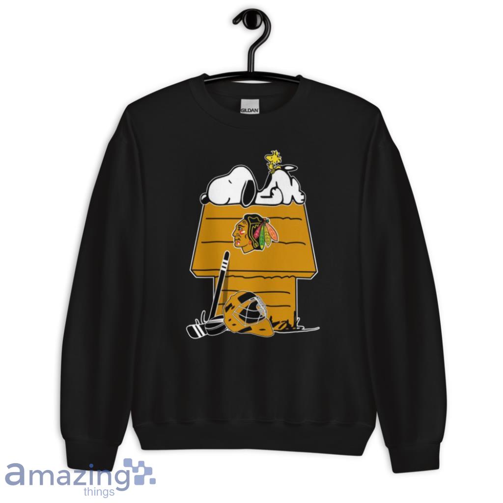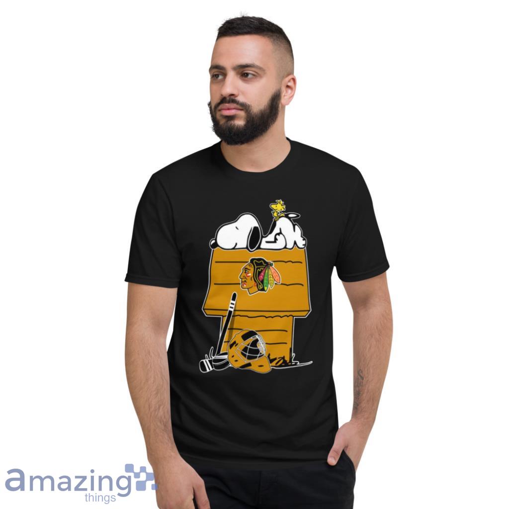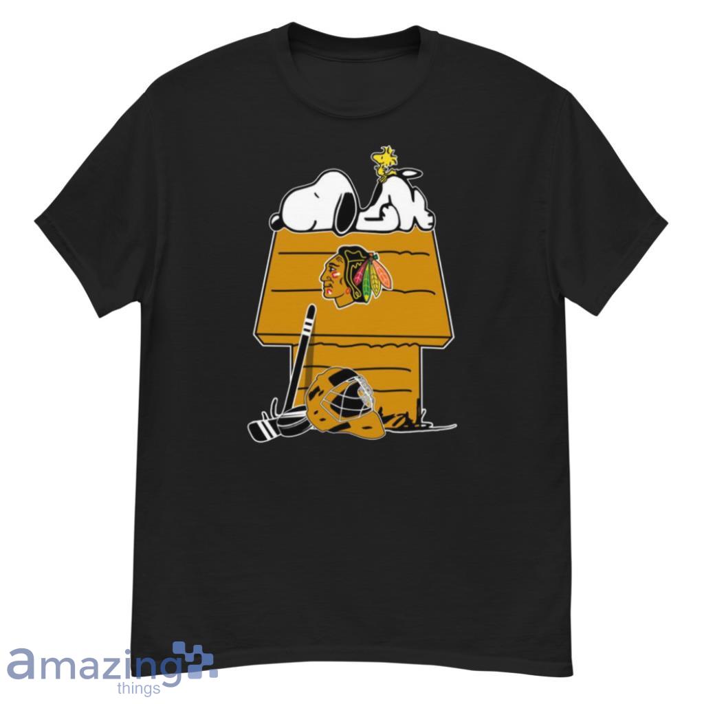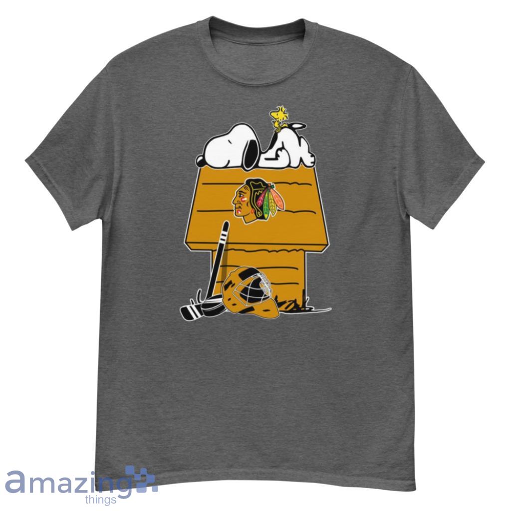 Featuring the iconic duo of Snoopy and Woodstock decked out in Blackhawks gear, this shirt captures the essence of both beloved franchises. The vibrant colors and intricate detailing make this a must-have for any true fan of the team and the Peanuts gang.
