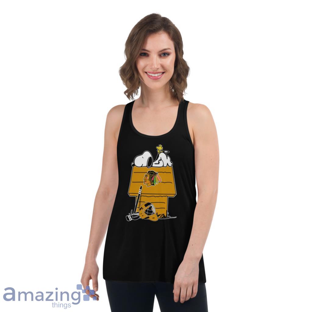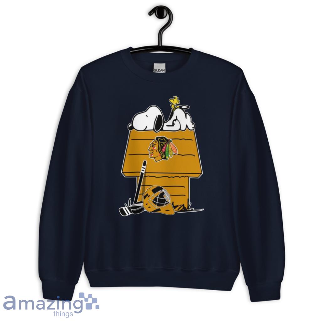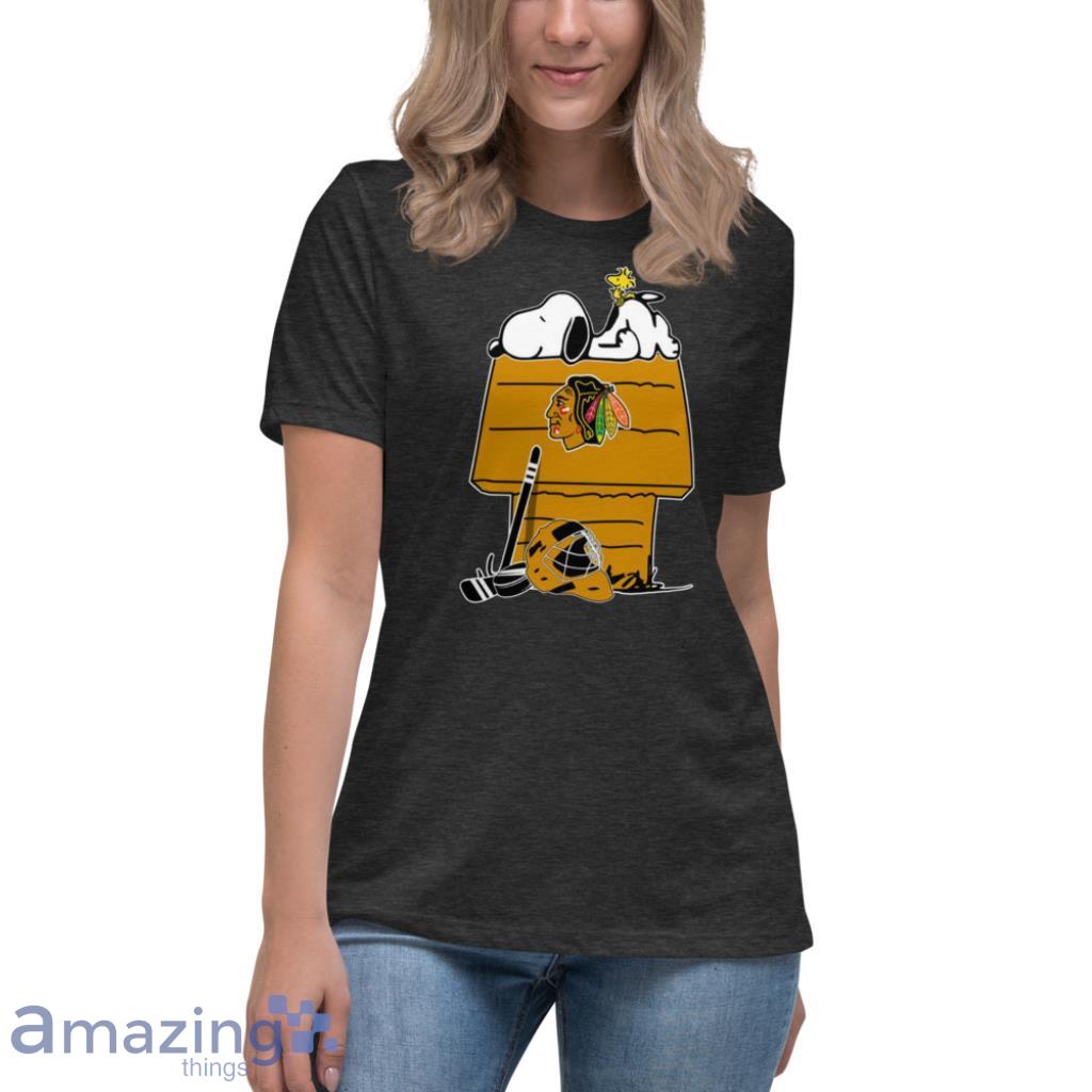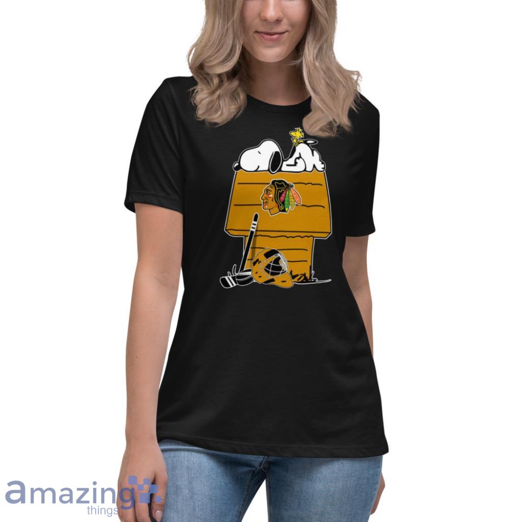 Featuring the iconic duo of Snoopy and Woodstock decked out in Blackhawks gear, this shirt captures the essence of both beloved franchises. The vibrant colors and intricate detailing make this a must-have for any true fan of the team and the Peanuts gang.