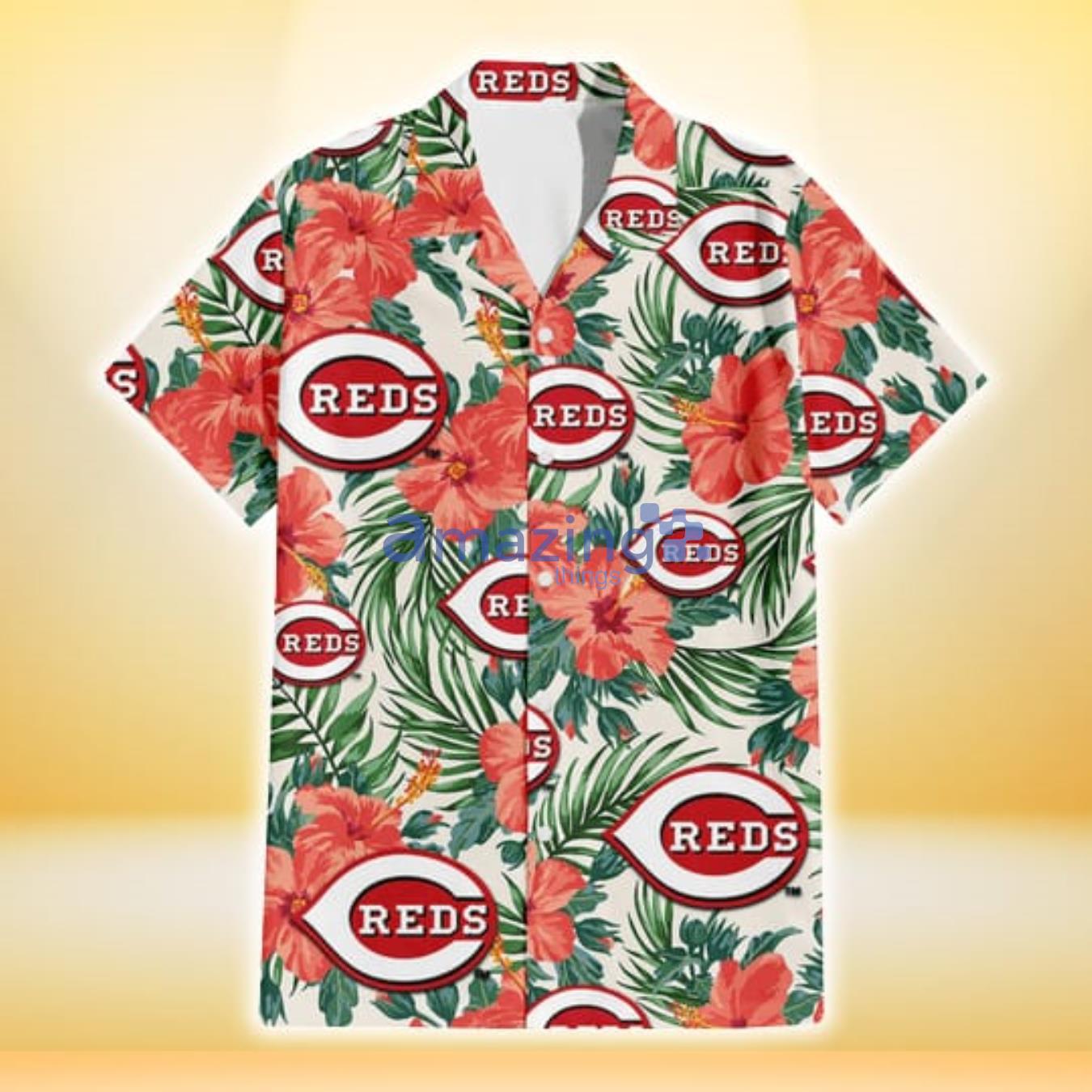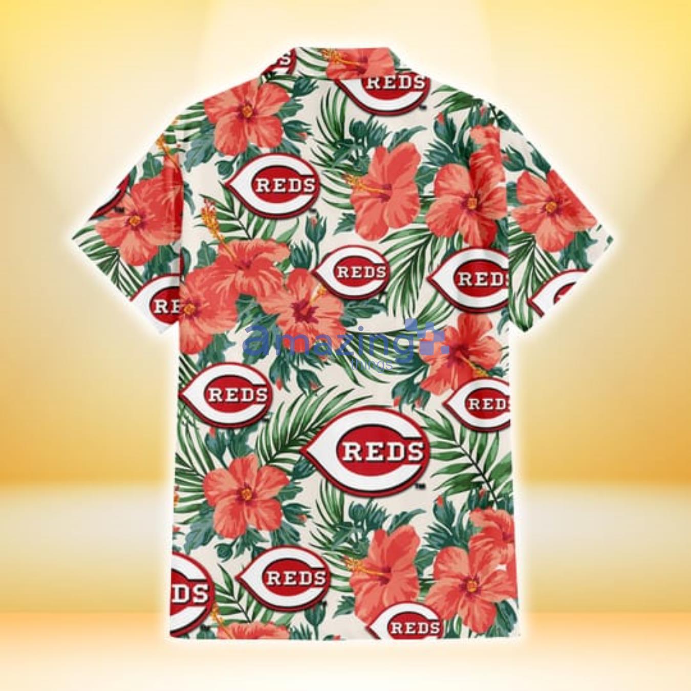 Cincinnati Reds Coral Hibiscus Green Leaf Beige Background 3D Hawaiian Shirt Gift For Fans