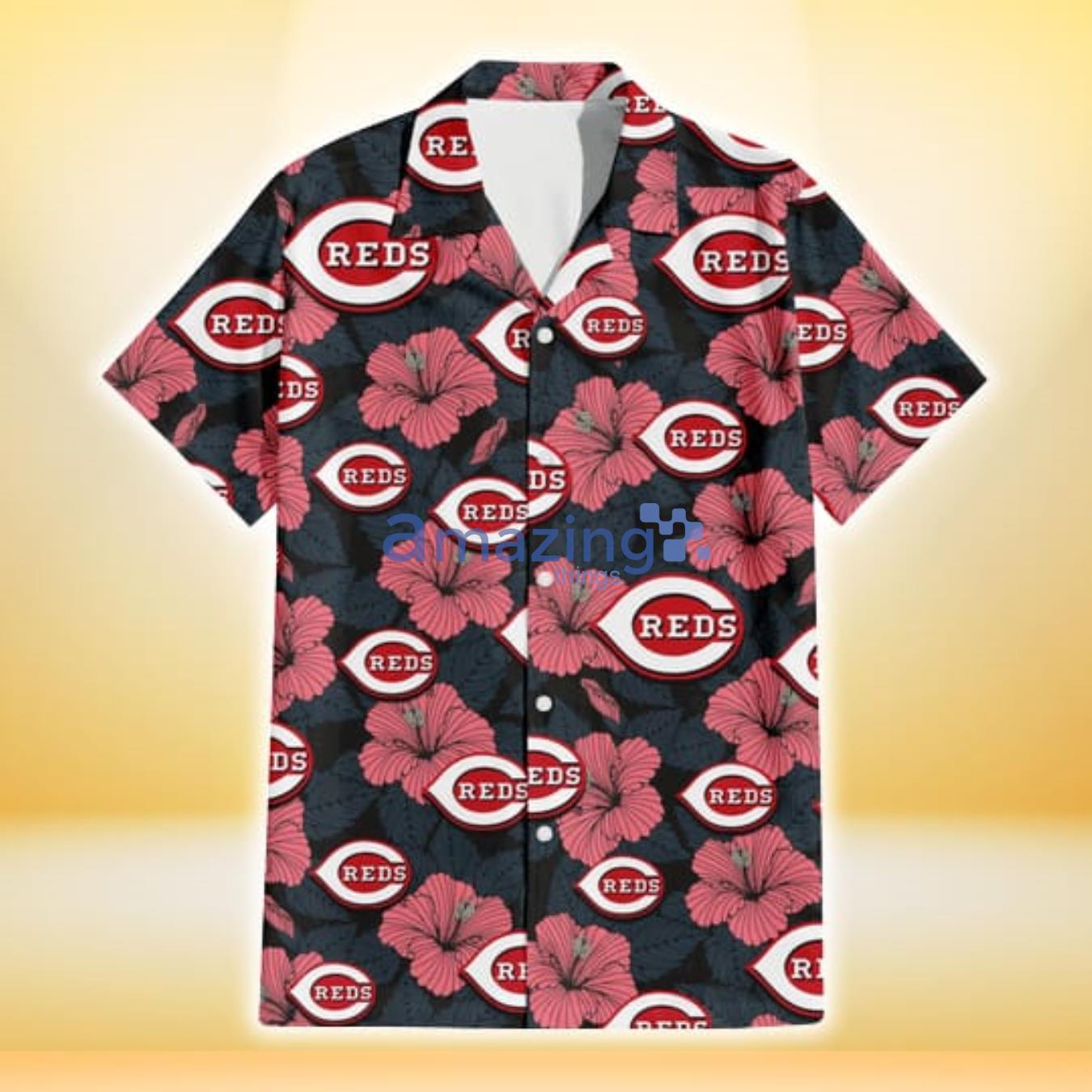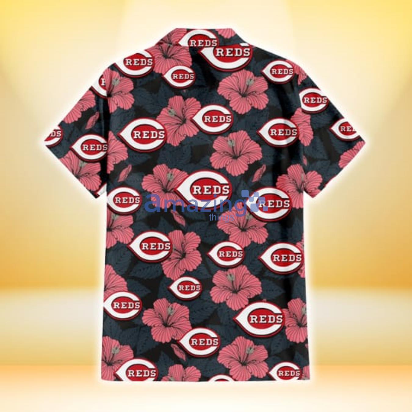 Some of the Cincinnati Reds Light Coral Hibiscus Gray Leaf Black Background 3D Hawaiian Shirt Gift For Fans photos