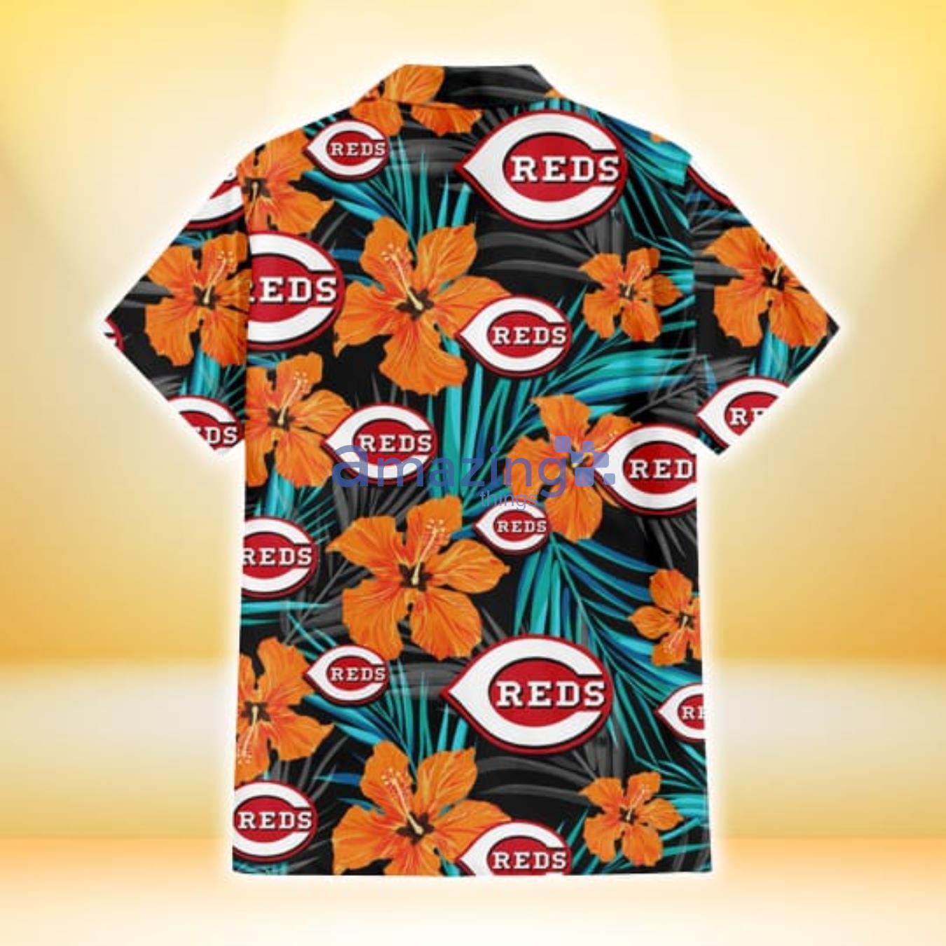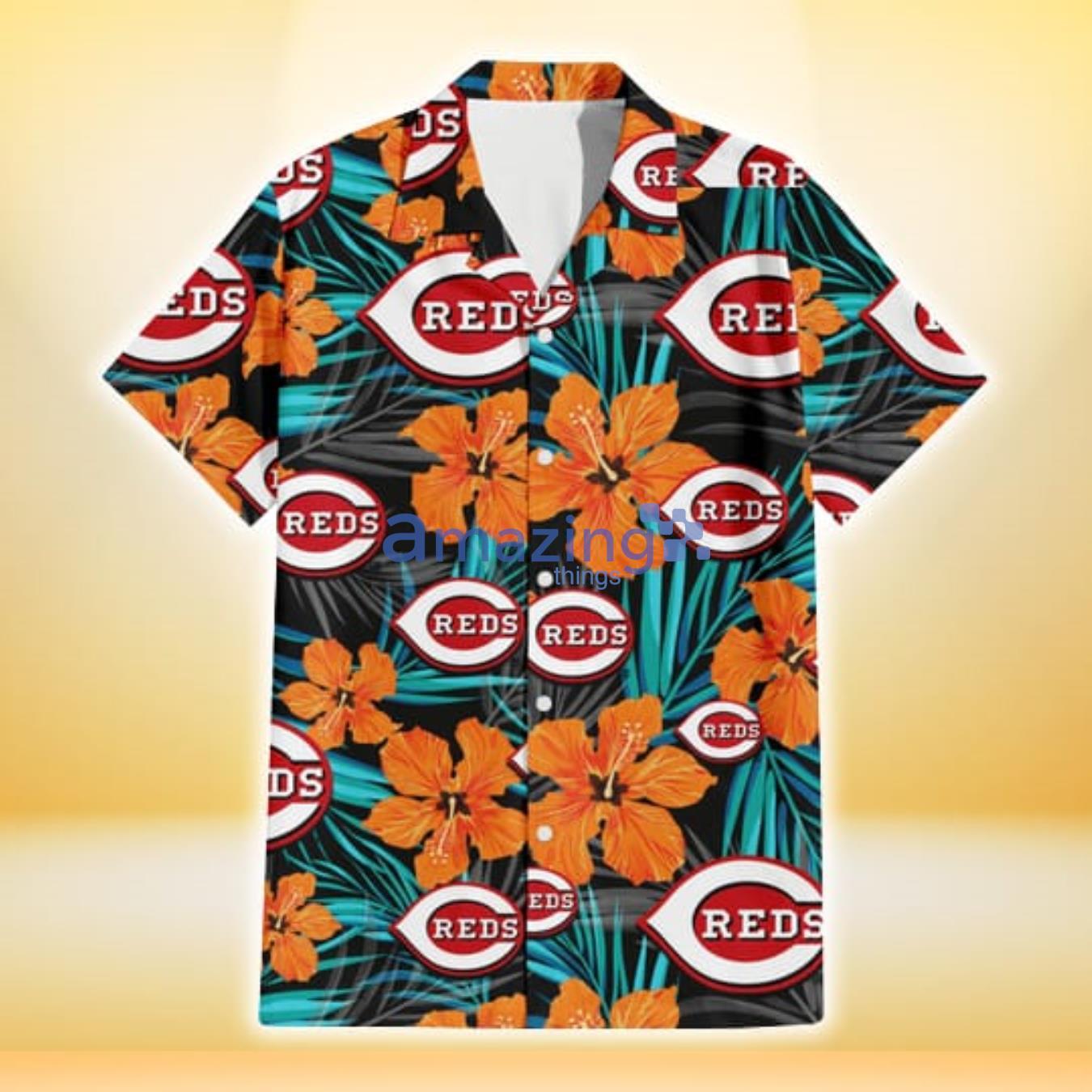 Some of the Cincinnati Reds Orange Hibiscus Blue Gray Leaf Black Background 3D Hawaiian Shirt Gift For Fans photos