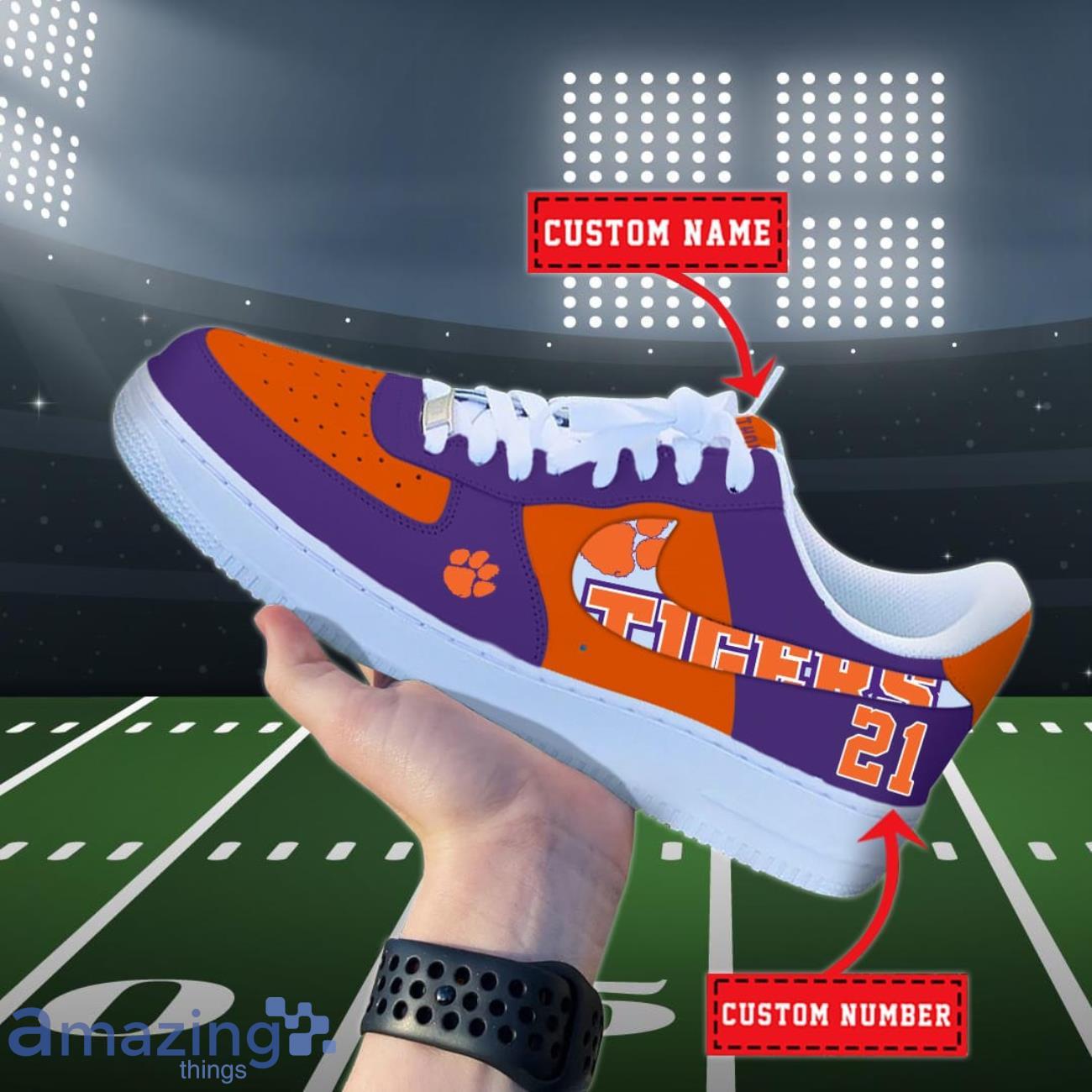 Crafted with premium materials, these shoes feature the iconic Clemson Tigers logo, proudly displayed on the side. The vibrant team colors will make you stand out from the crowd, while the custom name option allows you to personalize your kicks and show off your support for your favorite team.