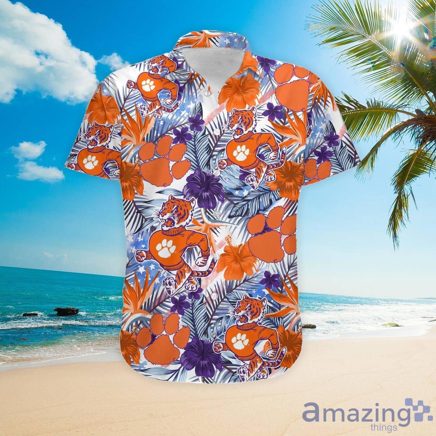 Introducing the Hawaiian shirt, perfect for any fan of the Clemson Tigers! This shirt features a tropical floral design with the Clemson Tigers logo and custom name on the back. Made from 100% cotton, this shirt is ideal for any warm weather occasion. Whether you’re cheering on your team at the game or relaxing at the beach, show your spirit in style with this Hawaiian shirt!