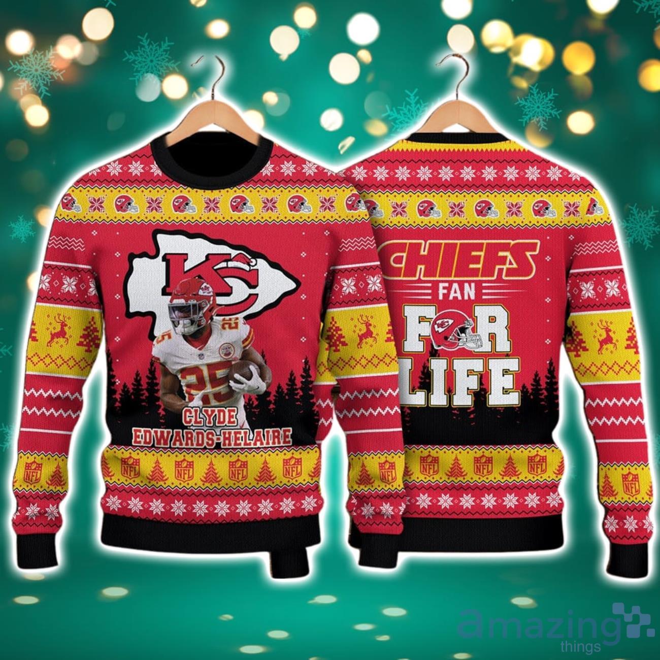 Don’t miss out on this limited edition Clyde Edwards-Helaire Kansas City Chiefs Fan For Life NFL Christmas Ugly Sweater – order yours today and become the envy of every Chiefs supporter!