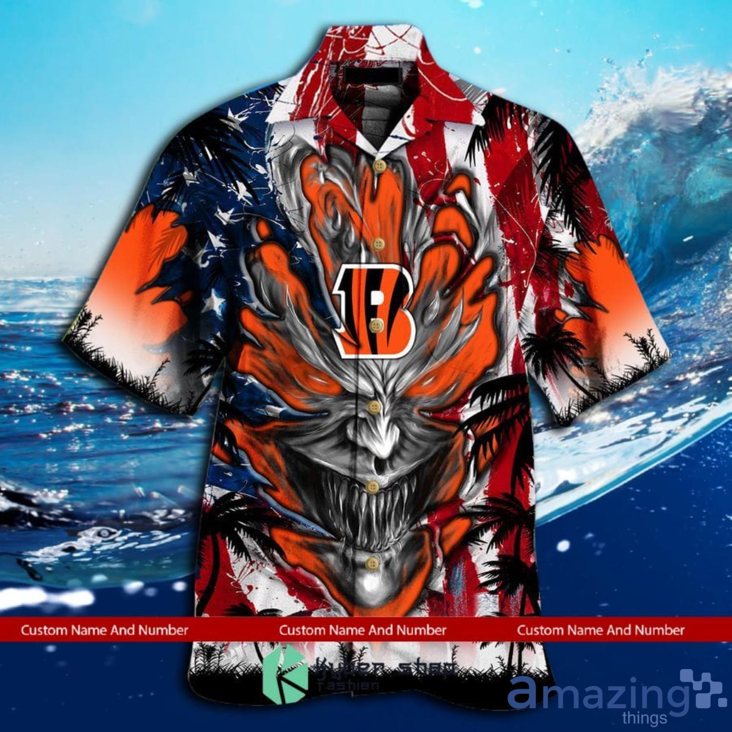 Custom Name And Number Cincinnati Bengals Us Flag Demon Face Hawaiian Shirt Details: