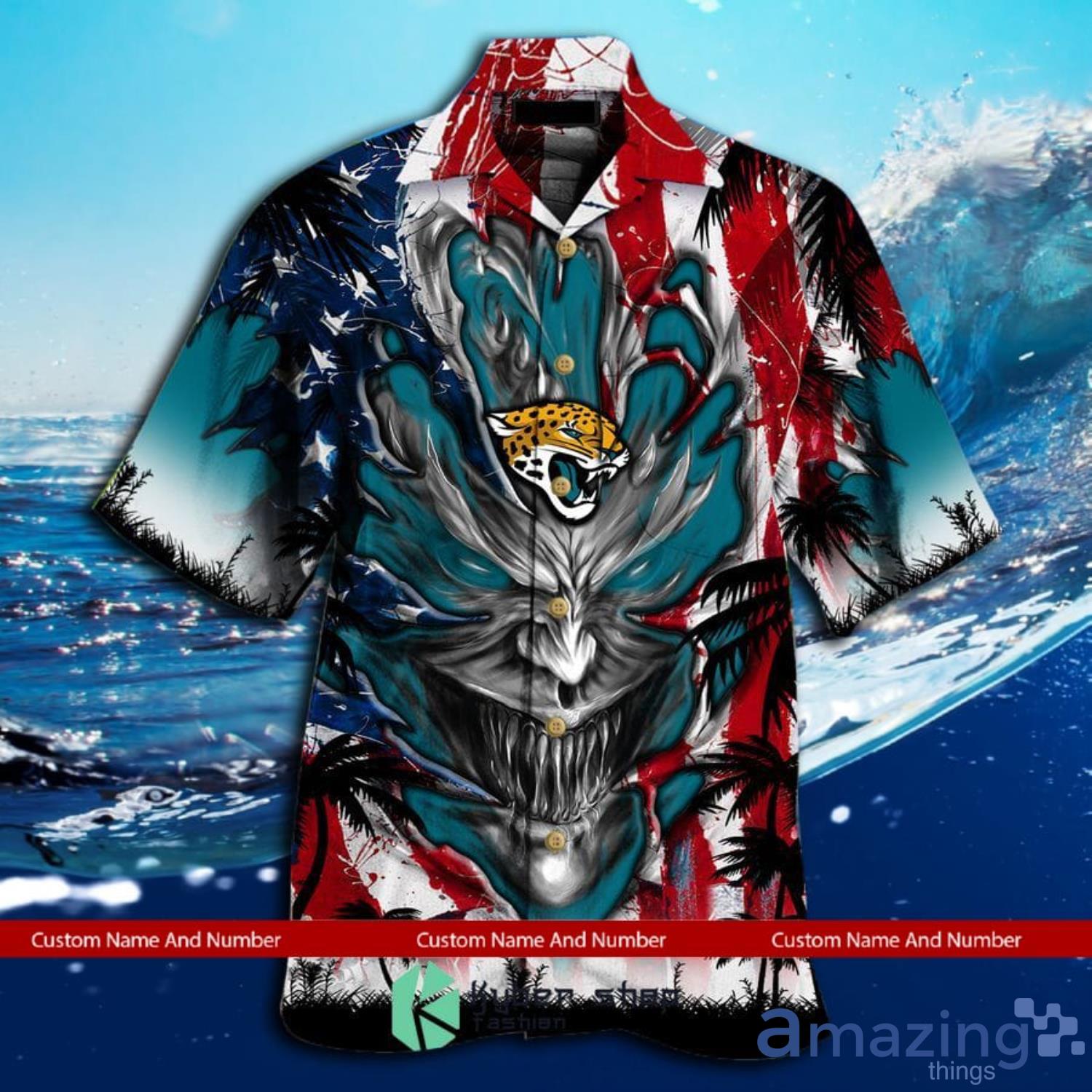 Some of the Custom Name And Number Jacksonville Jaguars Us Flag Demon Face Hawaiian Shirt photos