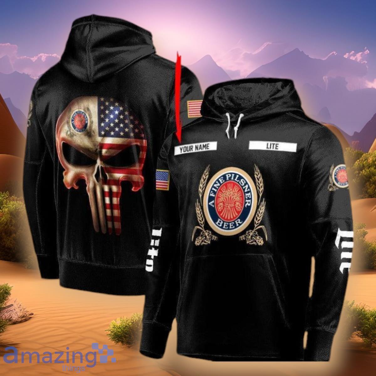 Some of the Custom Name Black USA Flag Skull Miller Lite 3D Hoodie Impressive Gift photos