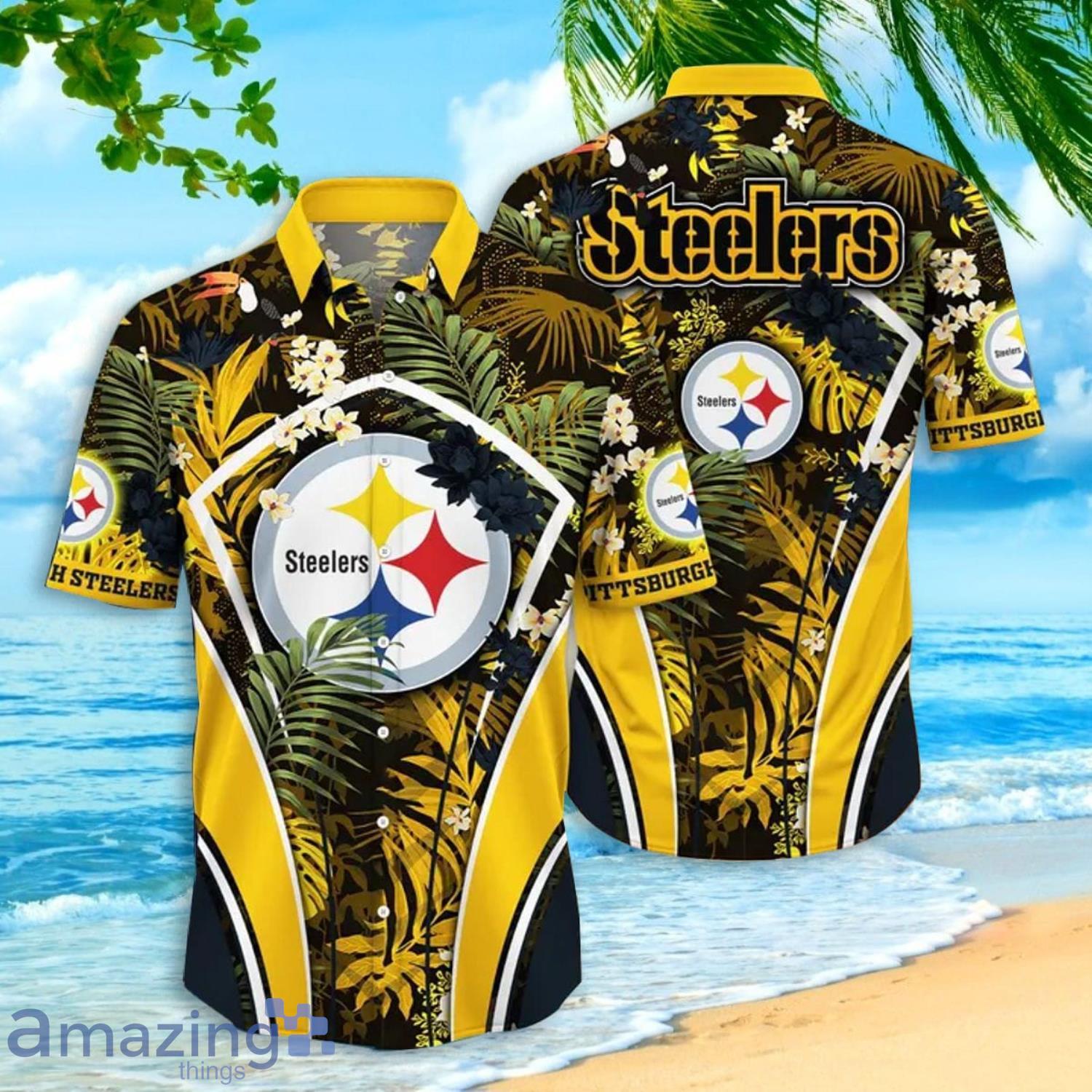 With its vibrant tropical flower design and bold Pittsburgh Steelers logo, this shirt is sure to turn heads wherever you go. And with the option to customize the shirt with your own name, it makes a great gift for any Steelers fan in your life.