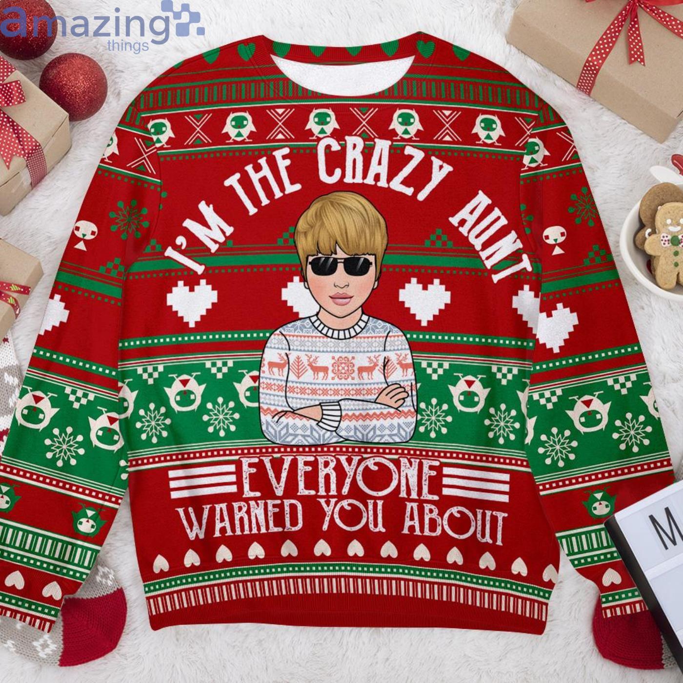 Some of the Custom Name I’m The Crazy Aunt Everyone Warned You About Christmas Ugly Sweater photos