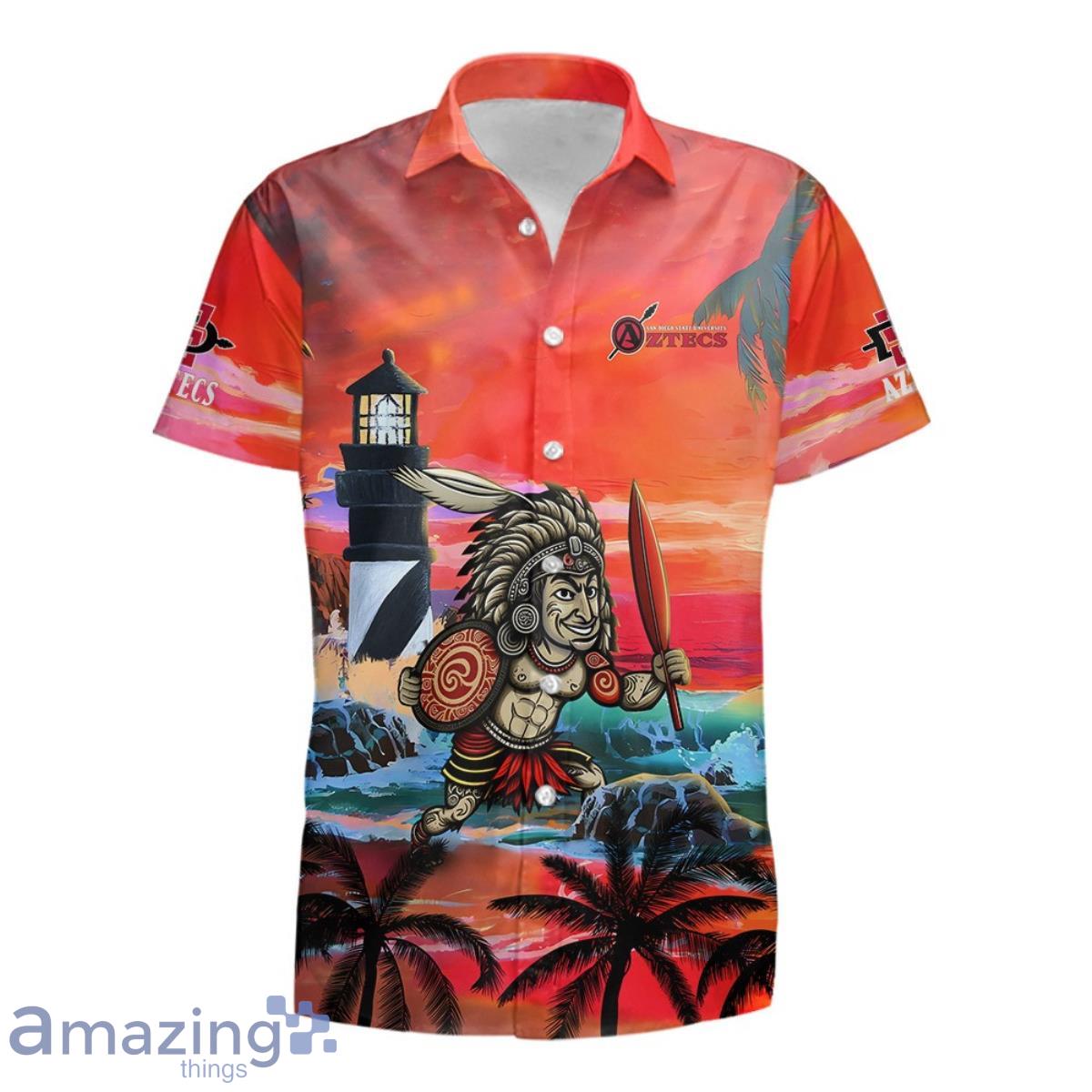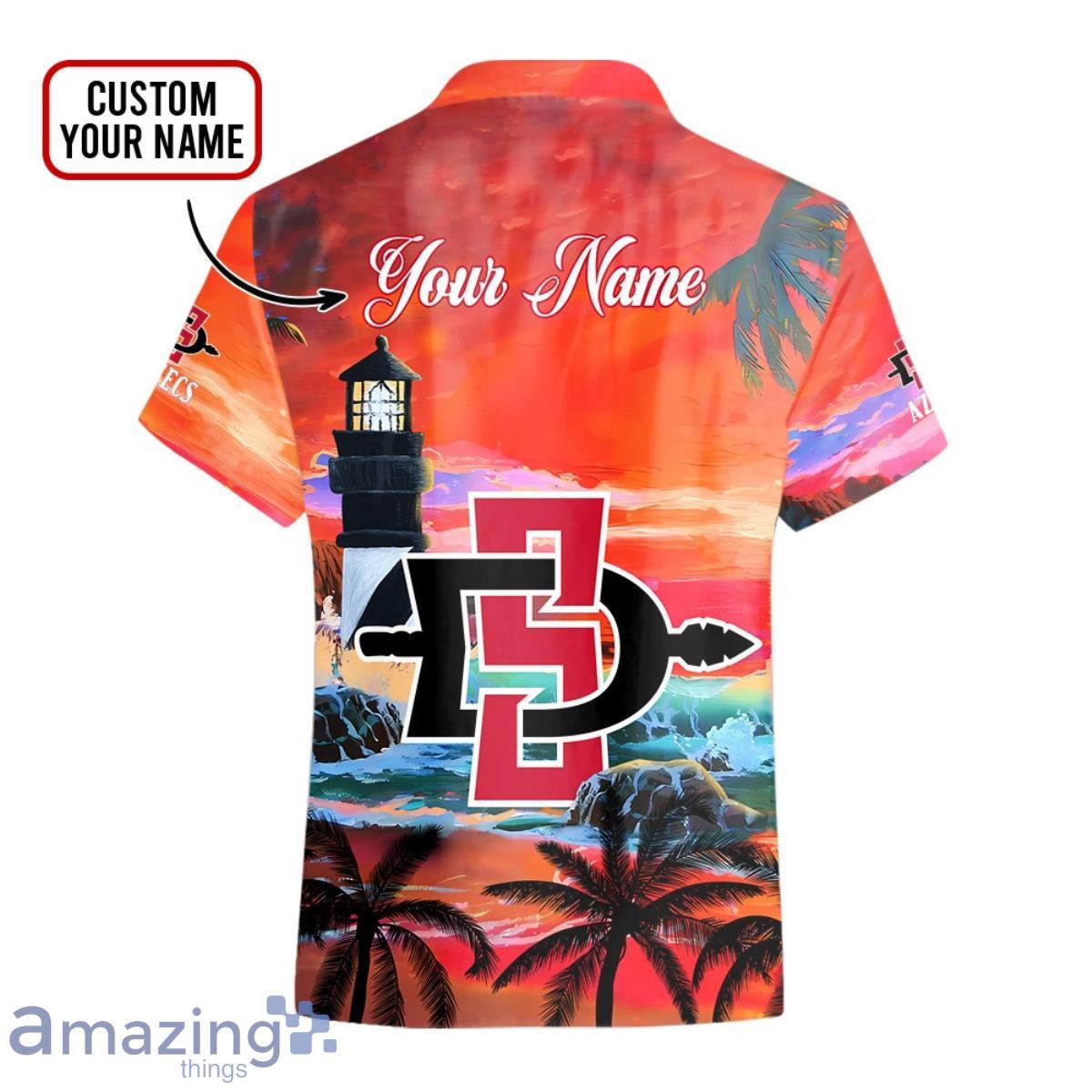 Some of the Custom Name San Diego State Aztecs Men’s Basketball Mascot Beach Pattern For Fans 3D Hawaiian Shirt photos