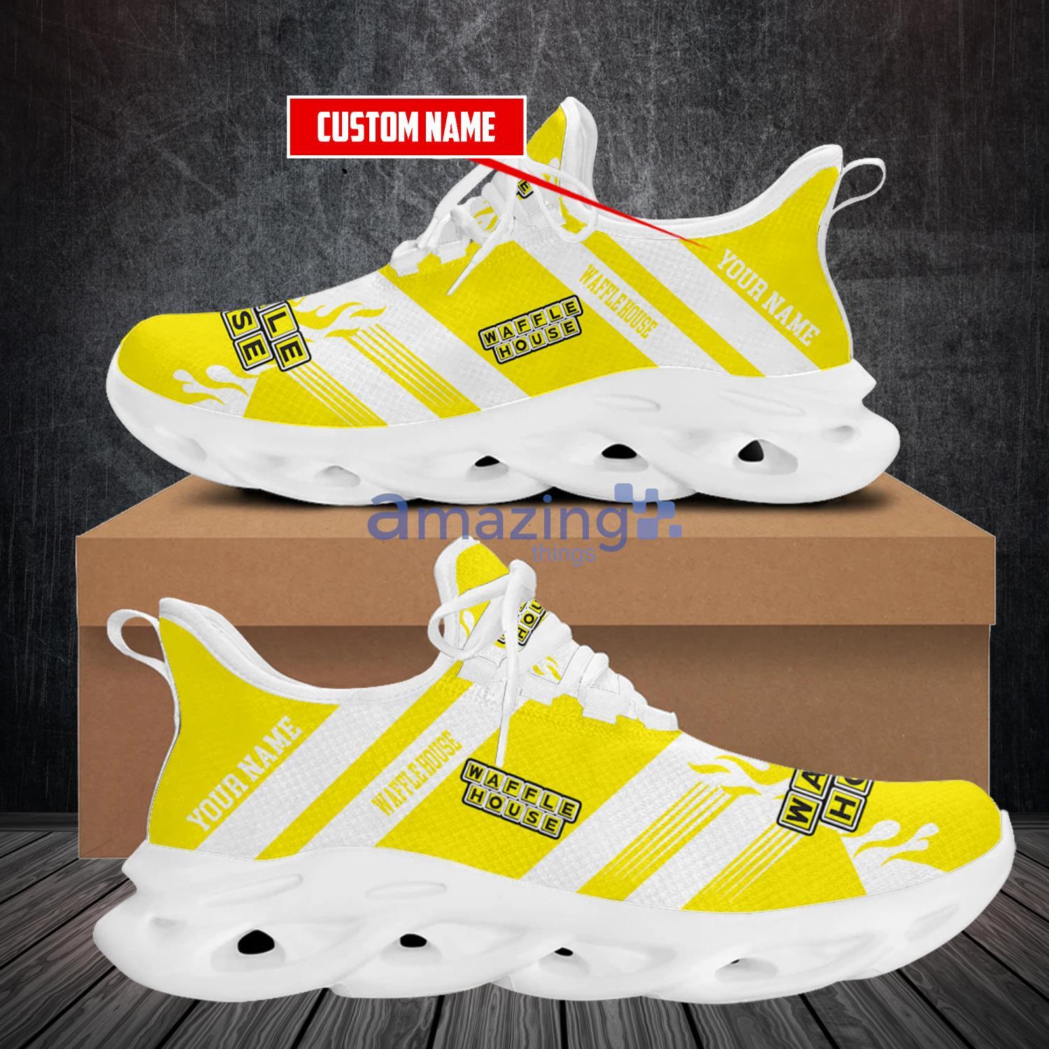 This Custom Name Waffle House Running Sneakers Men And Women Max Soul Shoes is a breathable, lightweight, and comfortable casual outdoor shoe that has a unique design. It is made of a mesh fabric which makes it sweat absorbent and breathable, while the rubber bottom ensures traction, comfort, and durability. It is available in two colors: black or white sole. There are two styles of shoelace holes so you can choose your preference.