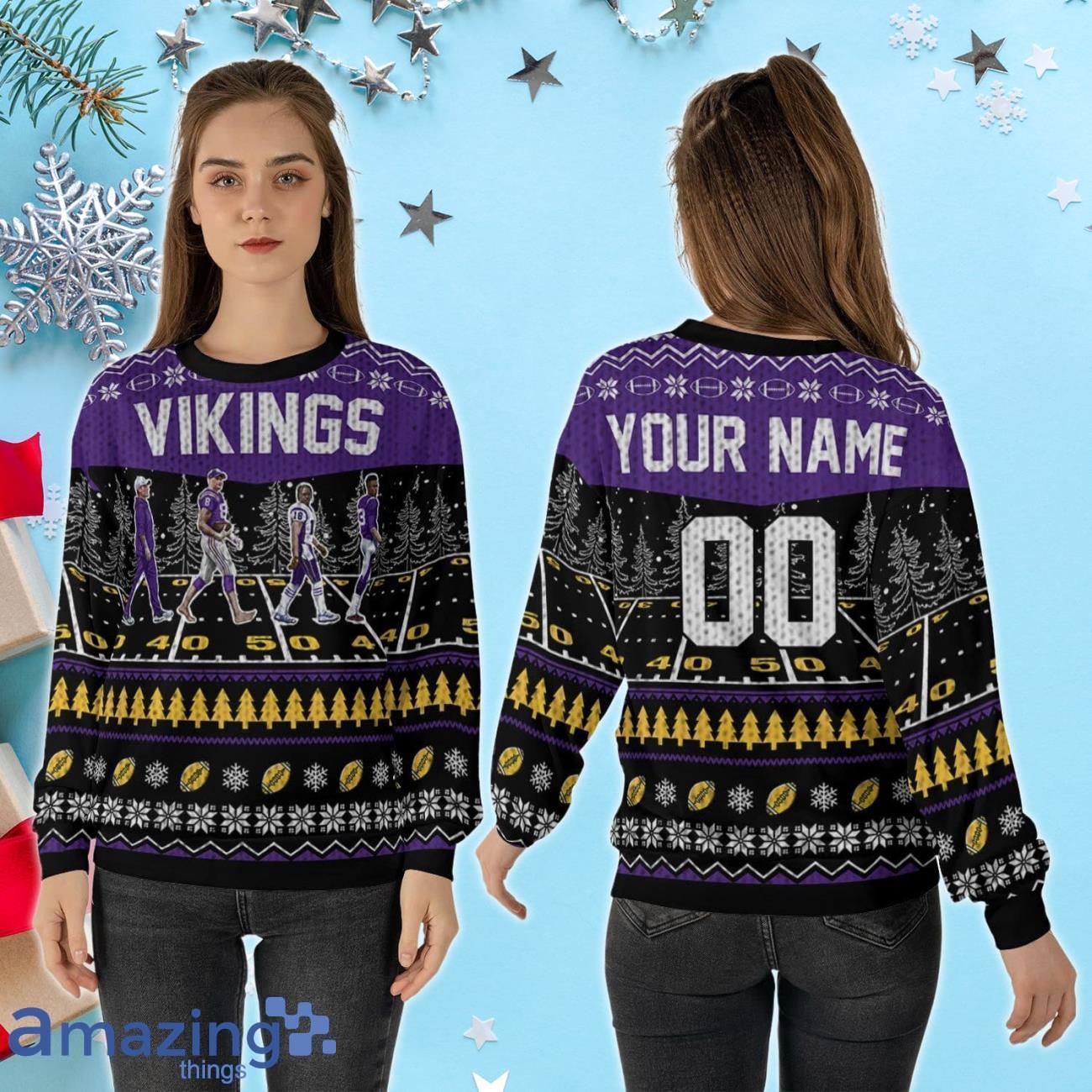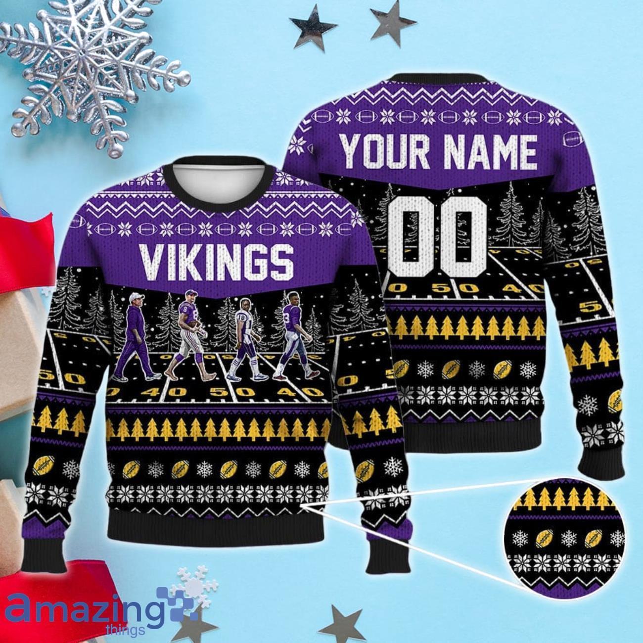 Some of the Custom Number & Name Minnesota Vikings Walking Abbey Road Christmas Sweater Kevin O’Connell, Cousins, Jefferson, Addison photos