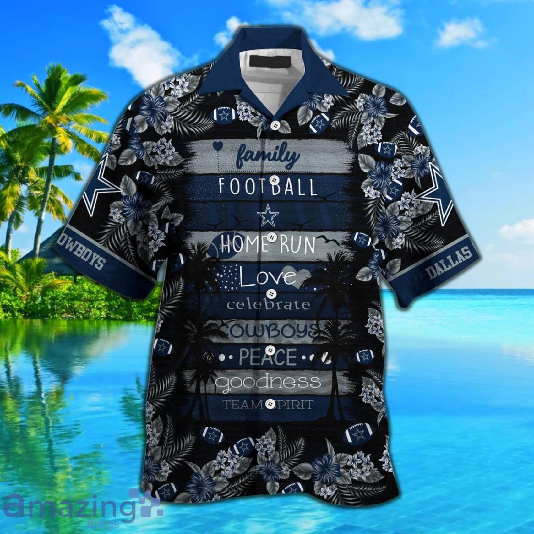 The shirt features a bold and colorful all-over print, showcasing the iconic Dallas Cowboys logo, team colors, and other classic football imagery. The design is printed on a high-quality, lightweight fabric that is perfect for warm weather and outdoor events. The Hawaiian-style cut and relaxed fit make it comfortable and easy to wear, while the button-down front and collar add a touch of sophistication.