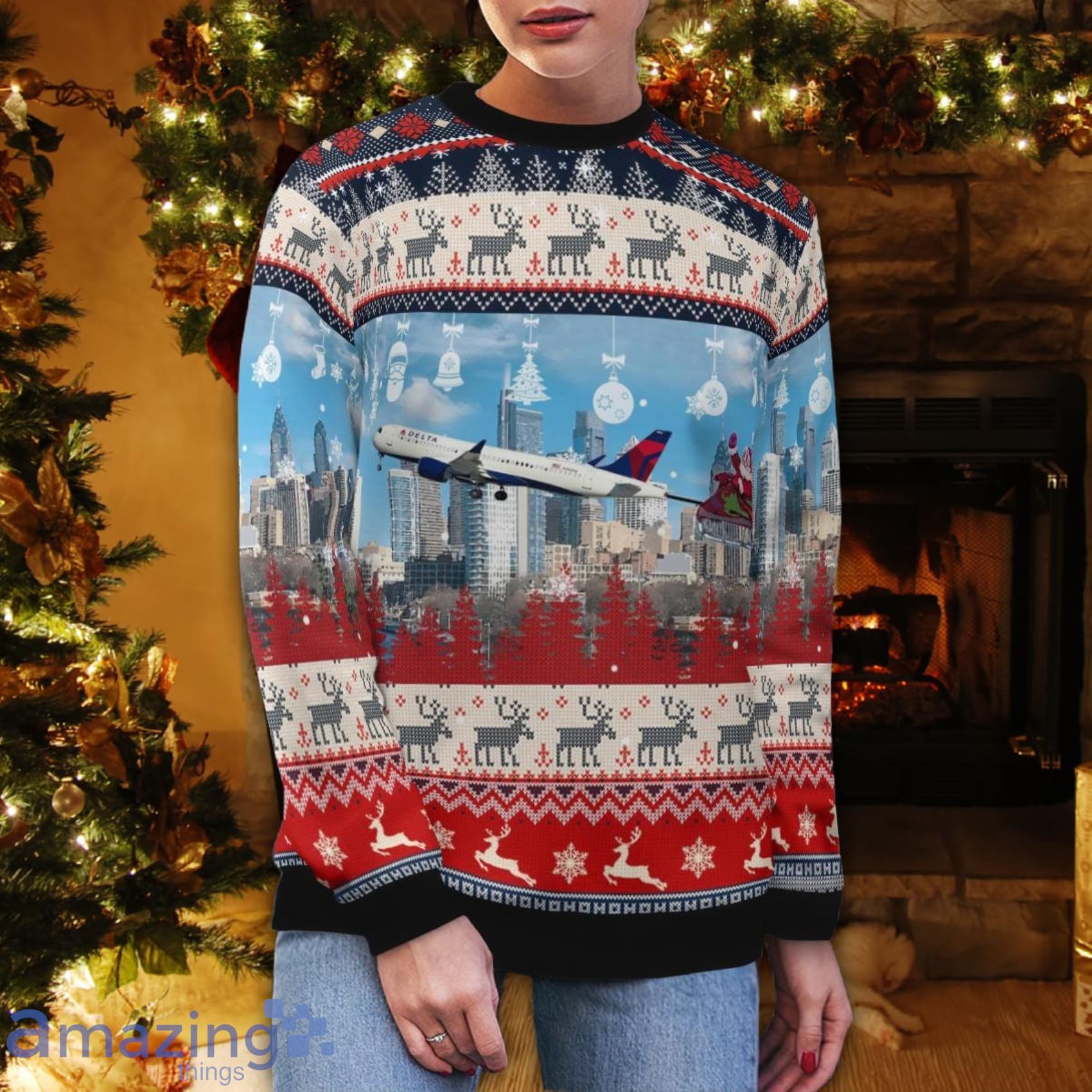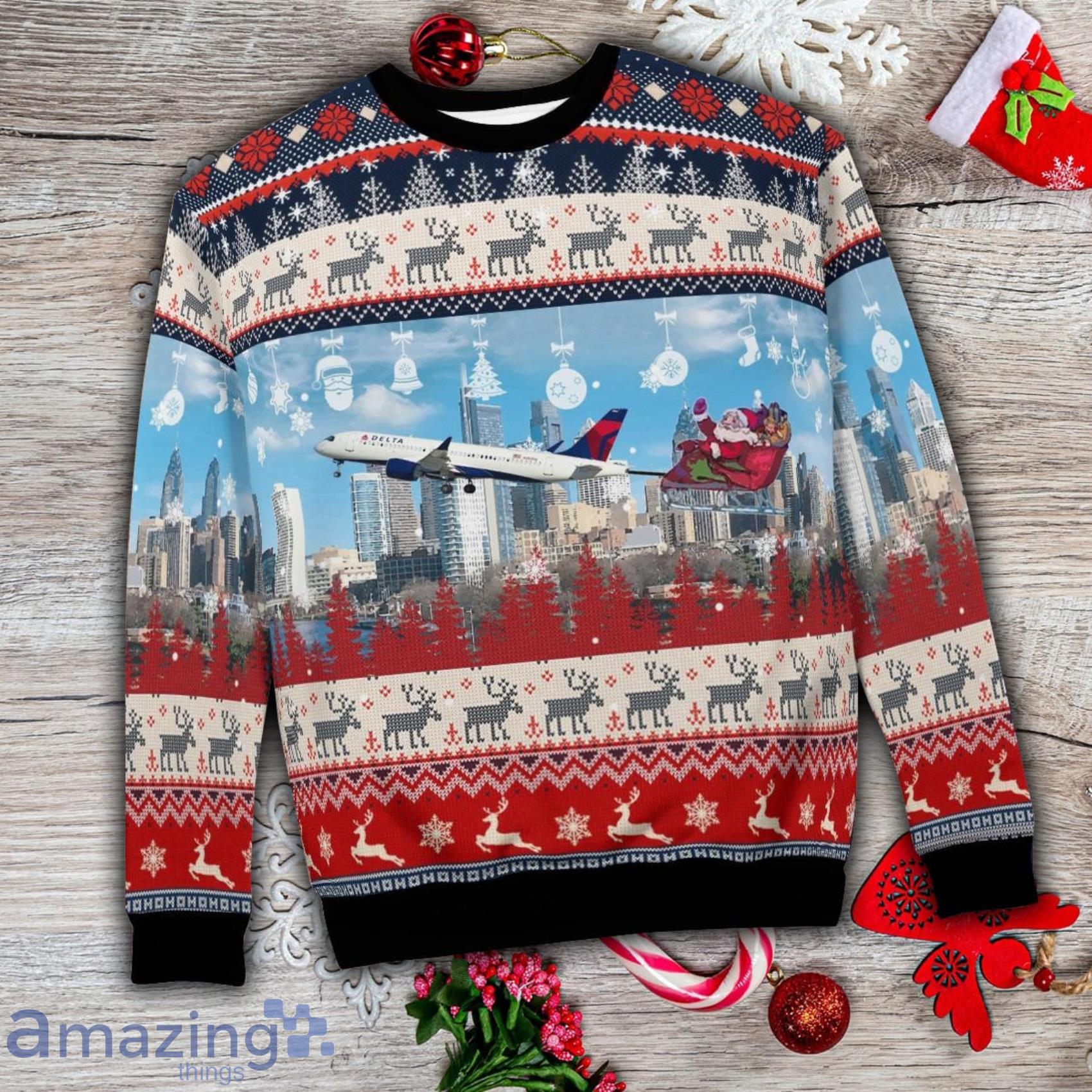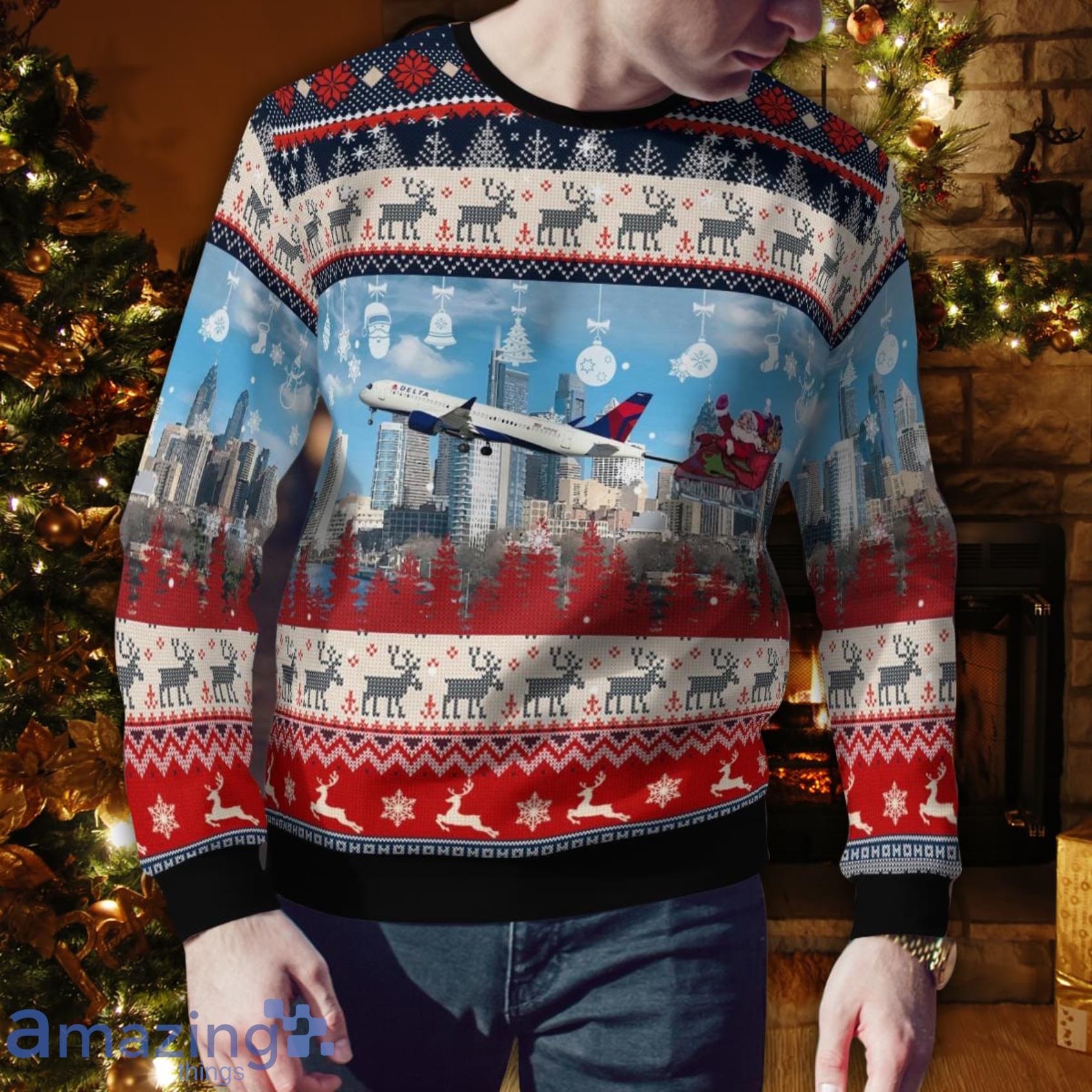 Some of the Delta Air Lines Airbus A220 300 With Santa Over Philadelphia Christmas 3D Ugly Sweater photos
