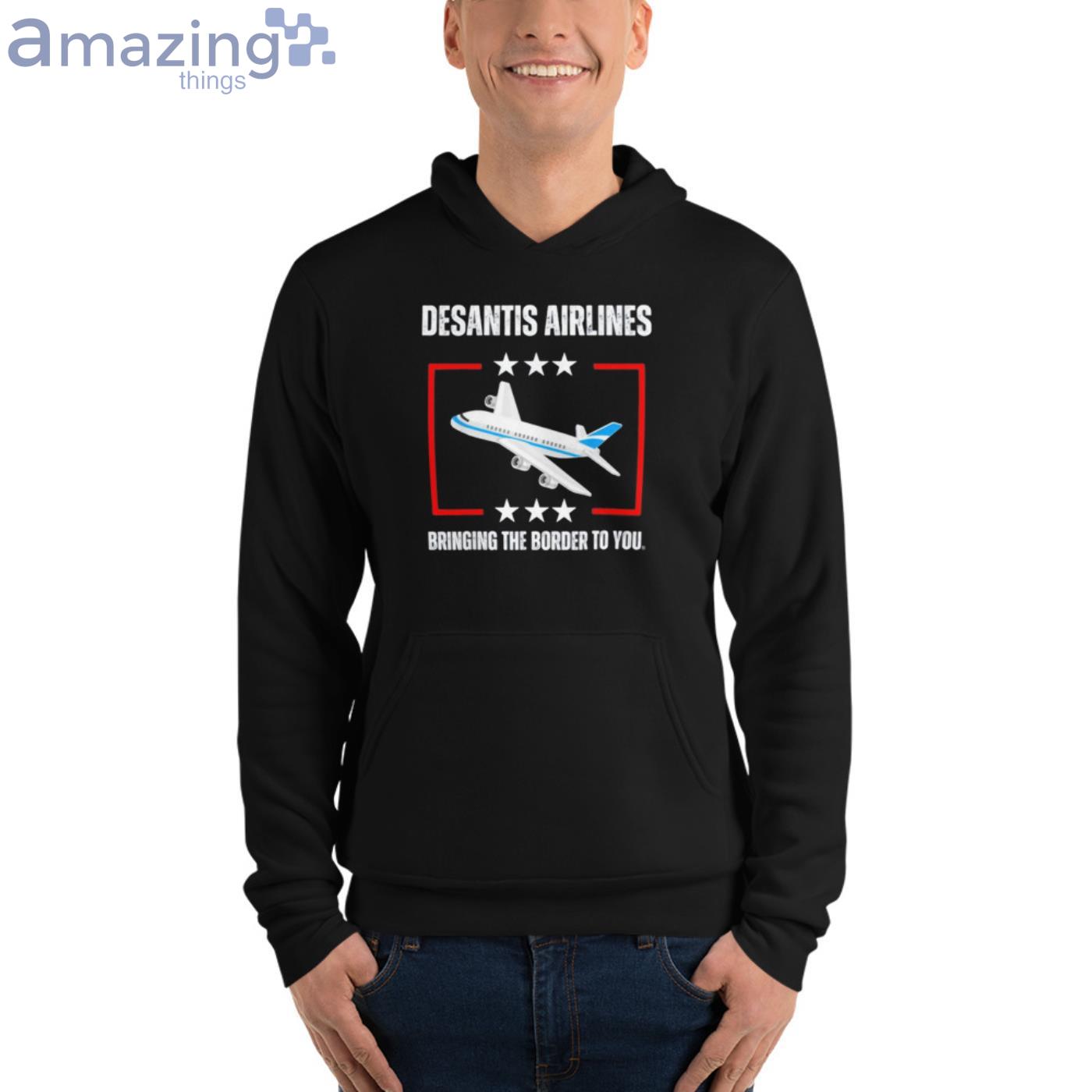 Introducing the all new Apparel from DeSantis Airlines! Now you can show your support for the company that’s working hard to keep America safe. This stylish T-shirt features the DeSantis Airlines logo on the front, and the slogan “Bringing The Border To You” on the back. It’s perfect for showing your pride in our country, and in DeSantis Airlines. Get yours today!