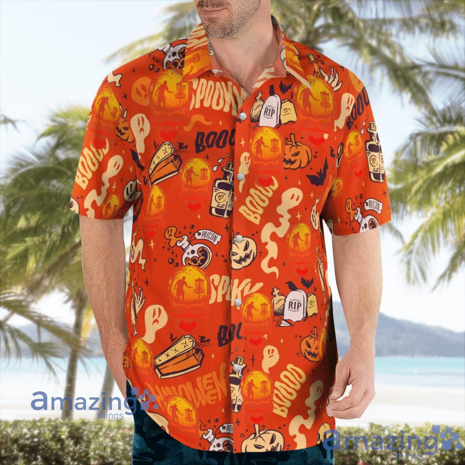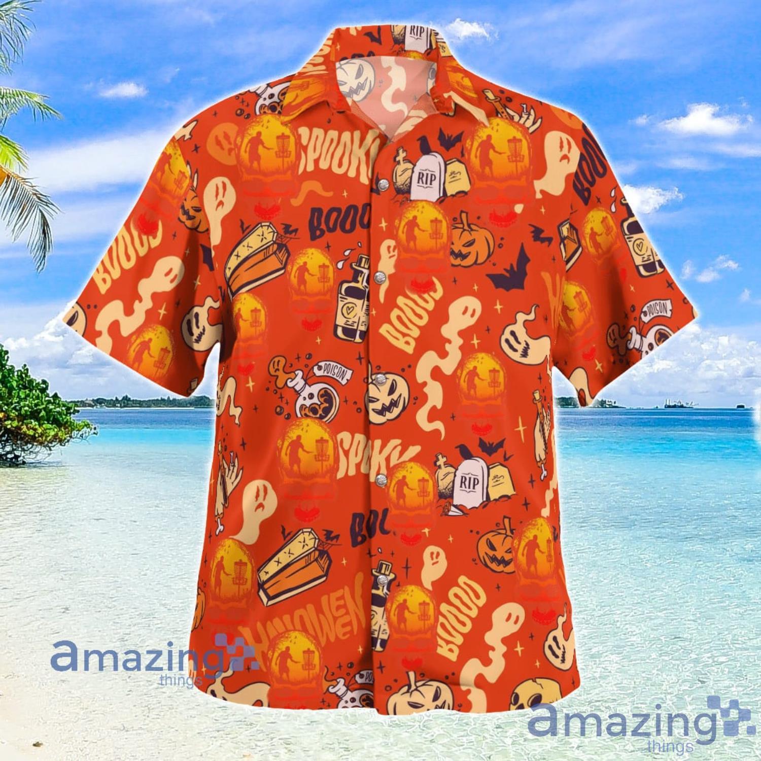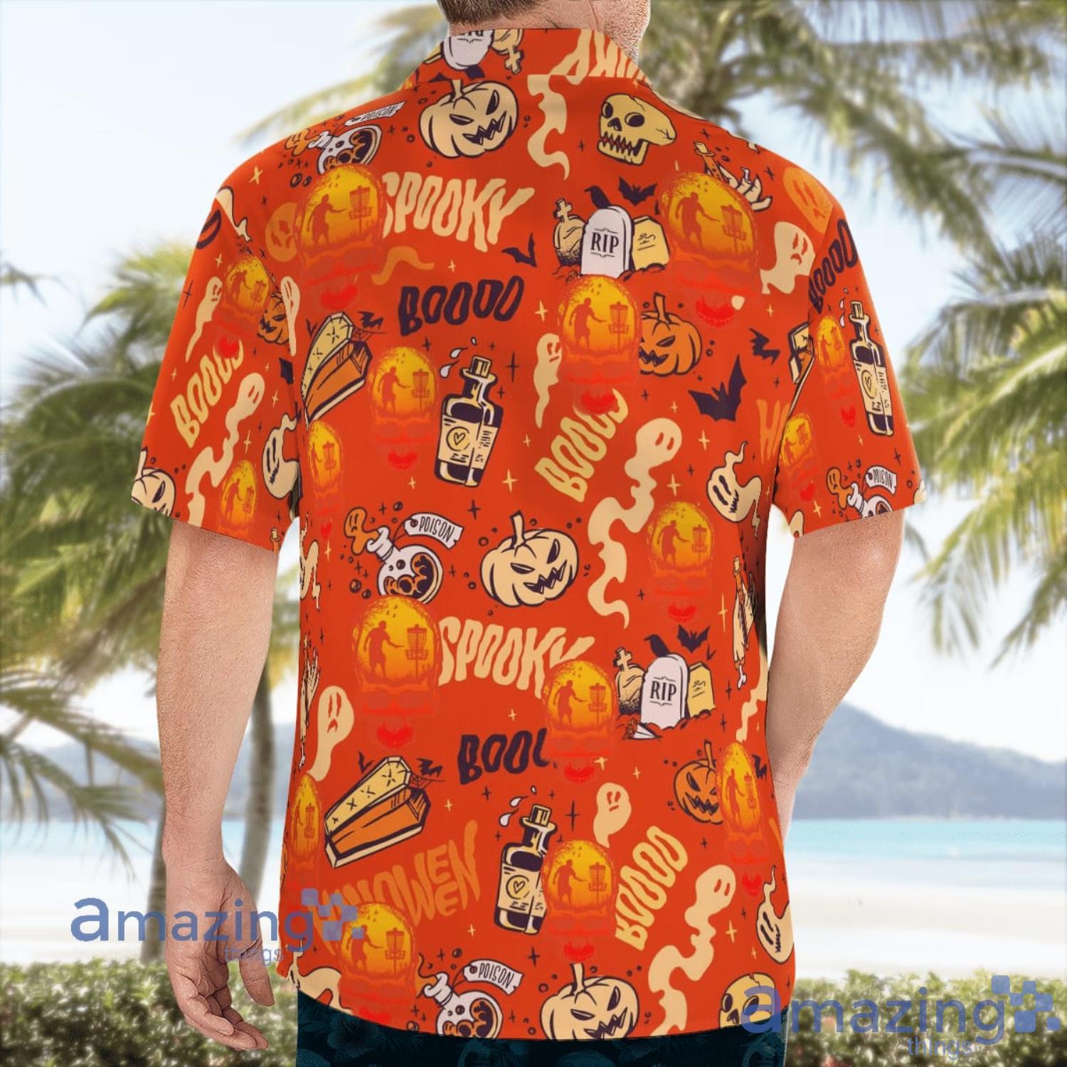 The Hawaiian shirt style adds a touch of tropical flair to the design, making it perfect for beach parties, barbeques, or any other summer event. The bright and vibrant colors used in the design perfectly complement the Halloween theme, making it stand out even more.