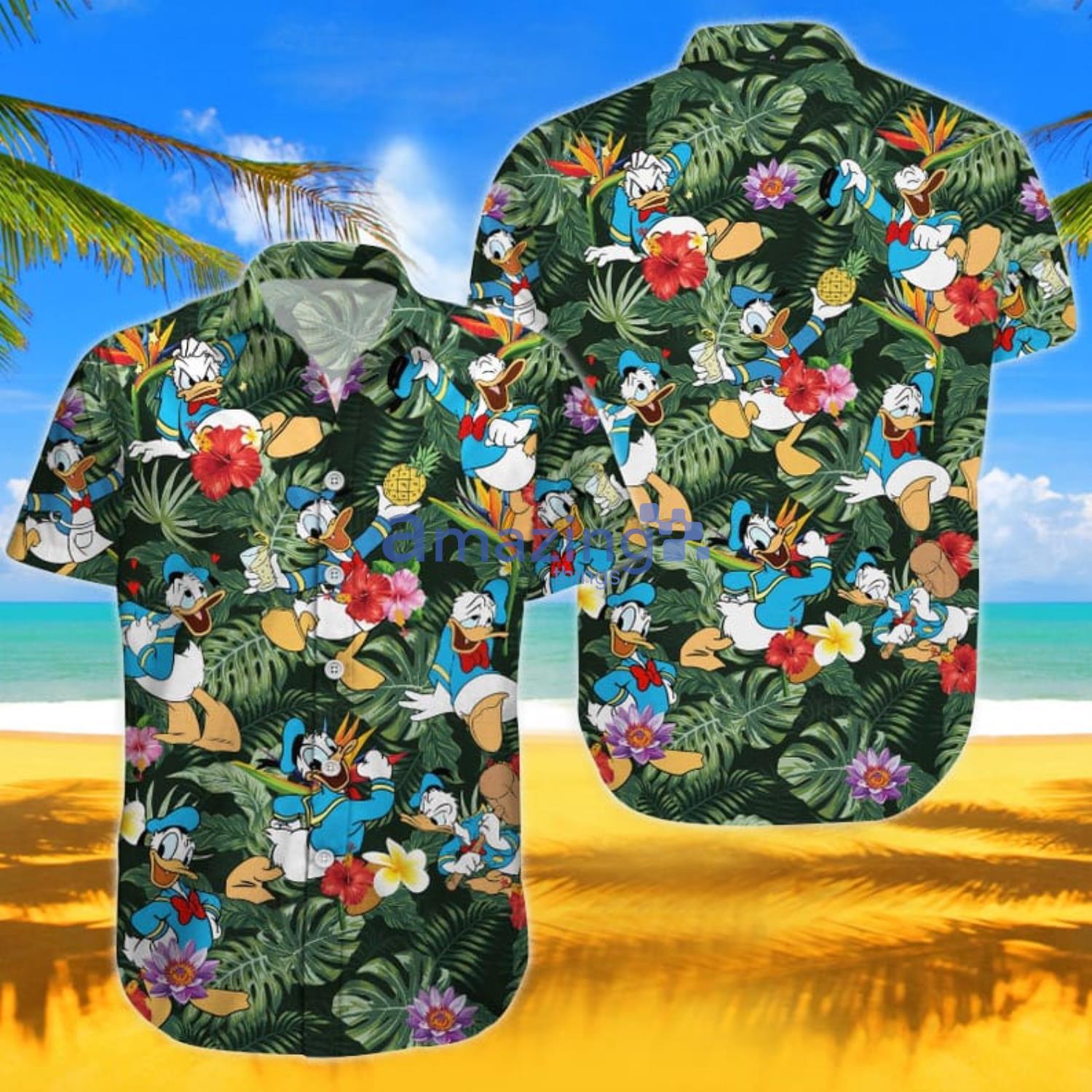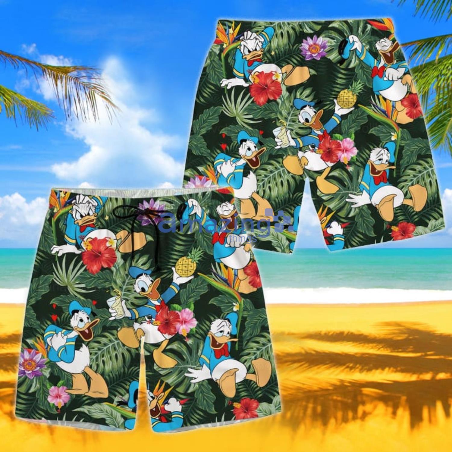 Featuring a bold and colorful Hawaiian shirt adorned with the iconic Donald Duck character and tropical pineapple motifs, this outfit is sure to turn heads wherever you go. The breathable and lightweight fabric ensures you stay cool and comfortable even on the hottest of days, making it the ideal choice for any tropical destination.