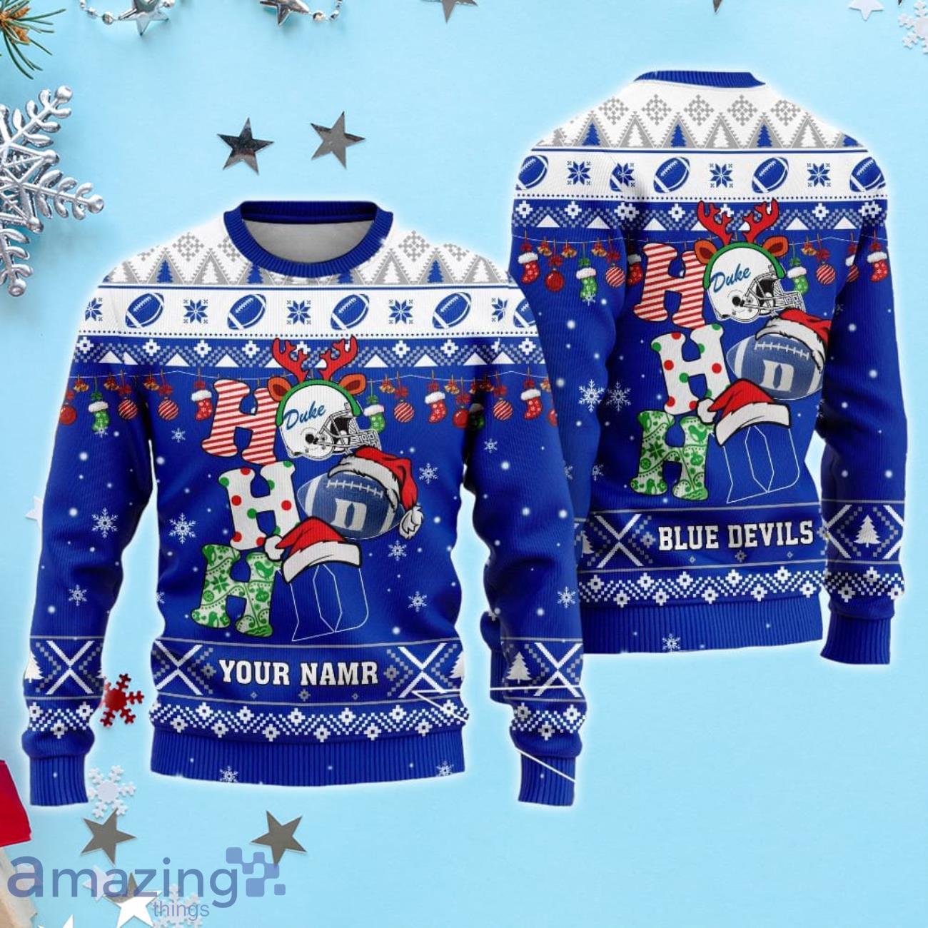 Duke Blue Devils Ho Ho Ho Santa’s Reindeer Ugly Christmas Sweater Xmas Gift For Fans Custom Name Informations: