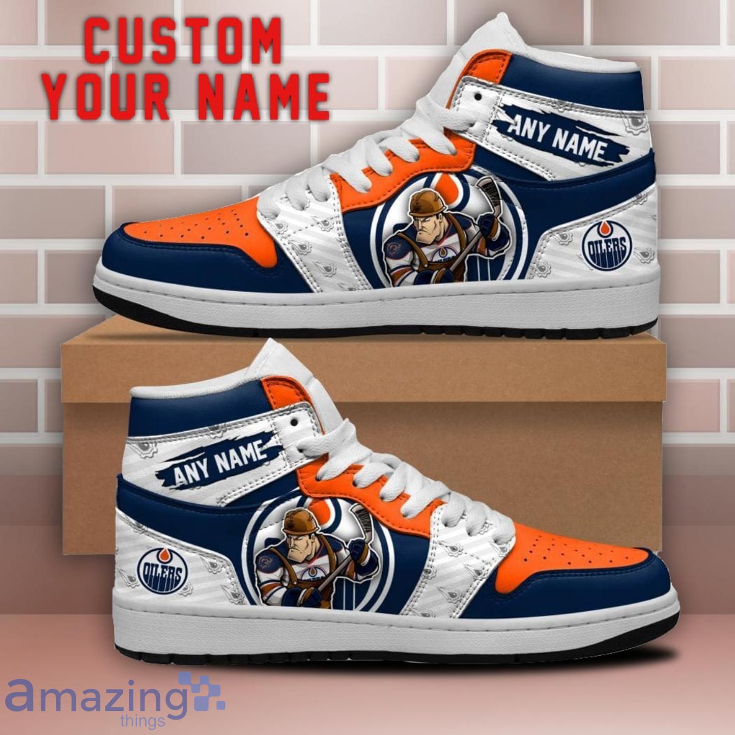 Show your team spirit in style with the Edmonton Oilers NHL Team Logo Printed Mascot Design Air Jordan Hightop Shoes Custom Name For Fans! These custom shoes feature the iconic Oilers logo and mascot design, making them the perfect accessory for any die-hard fan. Personalize them with your name to truly make them your own. Step out in these unique and eye-catching shoes to show your support for your favorite team on and off the ice. Get your hands on these exclusive Edmonton Oilers Air Jordans today!