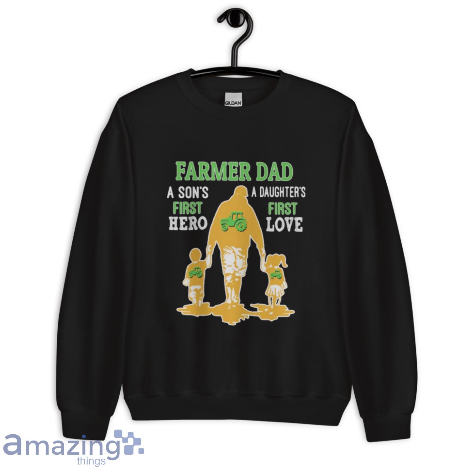 The shirt boasts a bold and eye-catching design that reads “Farmer Dad A Son’s First Hero A Daughter’s First Love Dad Happy Father’s Day.” The design is printed using advanced printing techniques that ensure it won’t fade or peel off even after multiple washes.