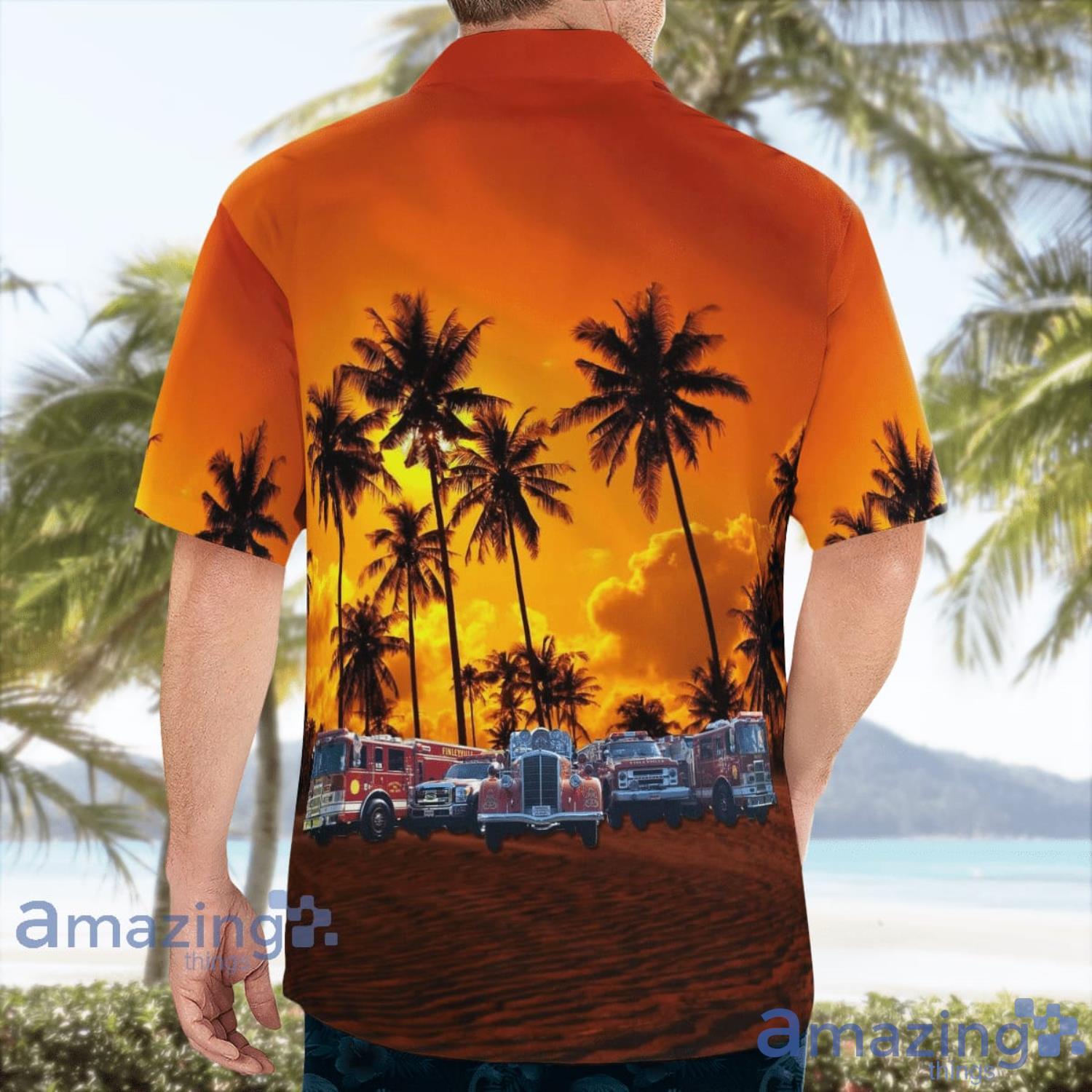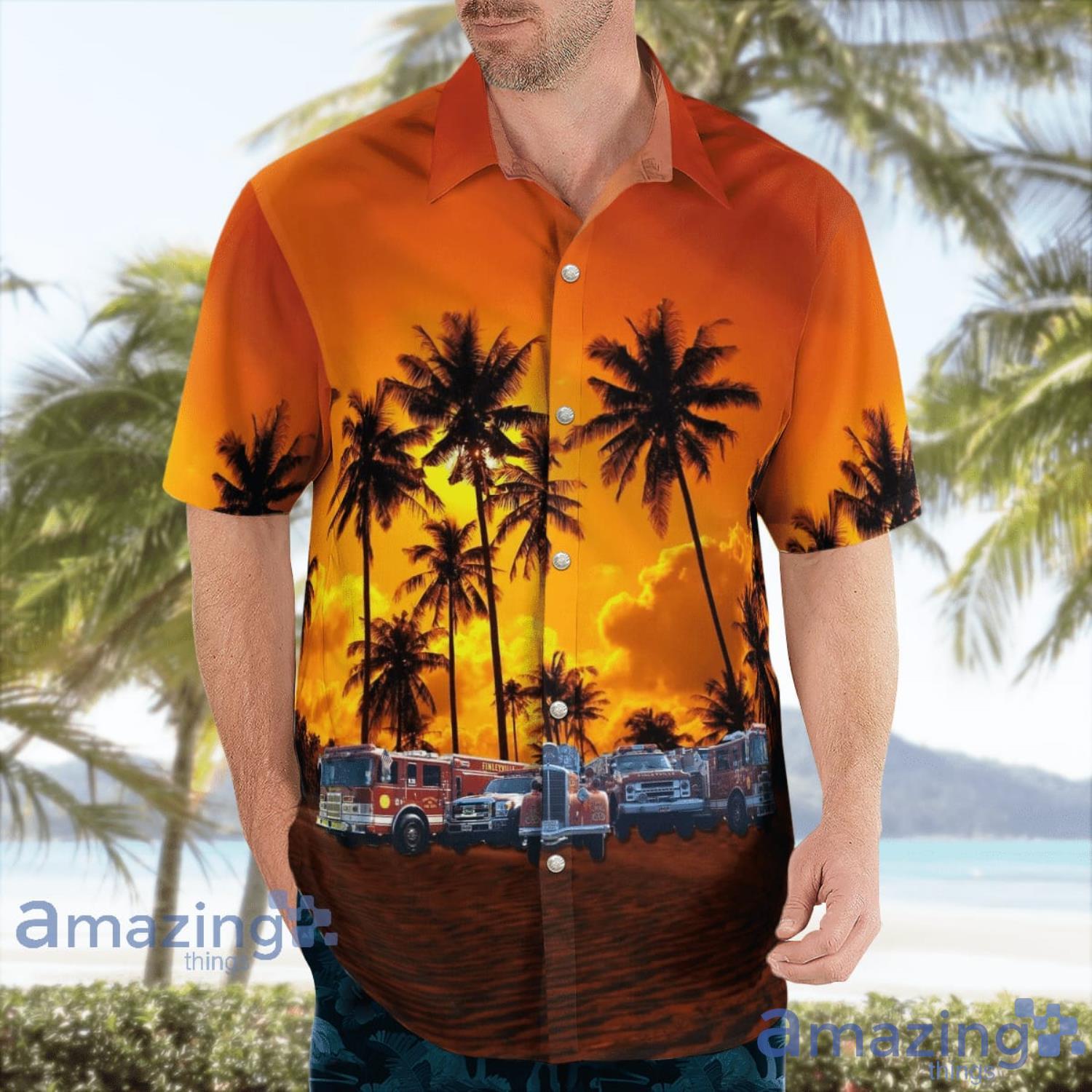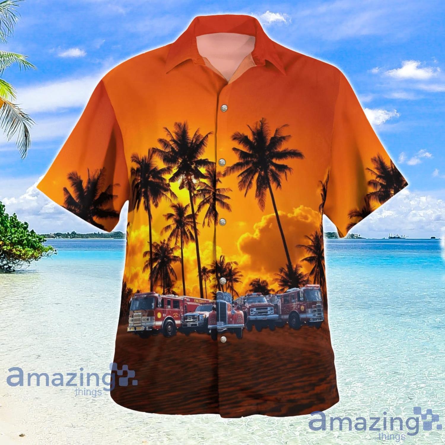 Crafted from high-quality materials, this shirt boasts a vibrant orange hue that will instantly brighten up any outfit. The Hawaiian-inspired design features a fun and playful pattern of fire department logos and symbols, making it the perfect choice for anyone who loves to stand out from the crowd.