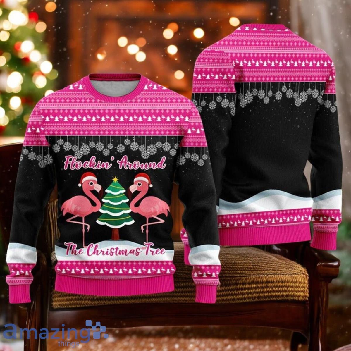 Don’t miss out on this unique piece of Christmas sweater perfection. Order your Flamingo Flocking Around The Christmas Tree Ugly Sweater today and bring a touch of tropical fun to your holiday season! Add a unique flamingo sweater to your wardrobe!