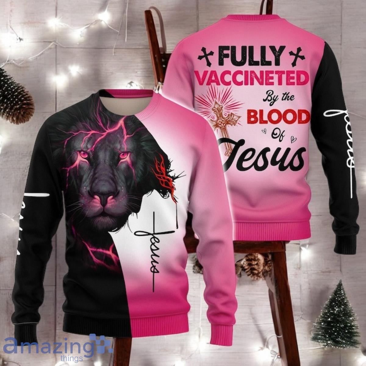 The design prominently features the phrase “Fully Vaccinated By The Blood Of Jesus,” playfully juxtaposed with traditional ugly Christmas sweater elements. Expect to see a mix of religious symbolism and holiday motifs, creating a visually engaging and conversation-starting piece. The color palette likely includes classic Christmas colors like red, green, and white, perhaps with accents of gold or silver to enhance the festive feel. The overall composition aims for a balanced blend of humor and reverence.
