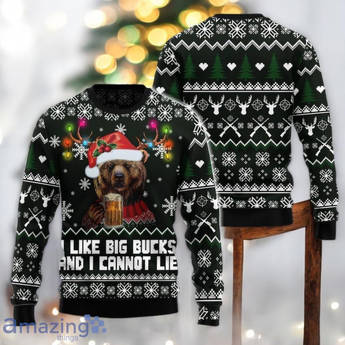The sweater features a comical illustration of a bear, likely adorned with festive accessories like a Santa hat or reindeer antlers. The prominent text, “I Like Big Bucks And I Cannot Lie,” is a humorous twist on a popular song lyric, adding a playful and irreverent touch. The color palette likely includes classic Christmas colors such as red, green, white, and gold, potentially incorporating patterns like snowflakes, reindeer, or geometric shapes to enhance the festive aesthetic. The overall composition is designed to be eye-catching and lighthearted, creating a memorable and amusing visual impact.