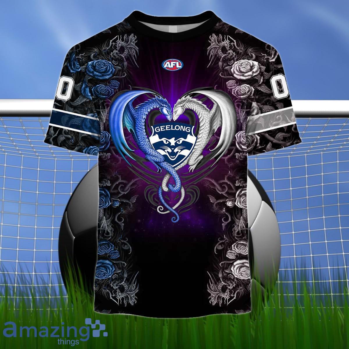 Perfect design for holiday. Get yours this shirt or this is a cute item for your daddy, gift for your mom, and gift for friends on any occasion. buy a cute Geelong Cats Custom Name And Number Rose Dragon 3D Shirt For Fans now.