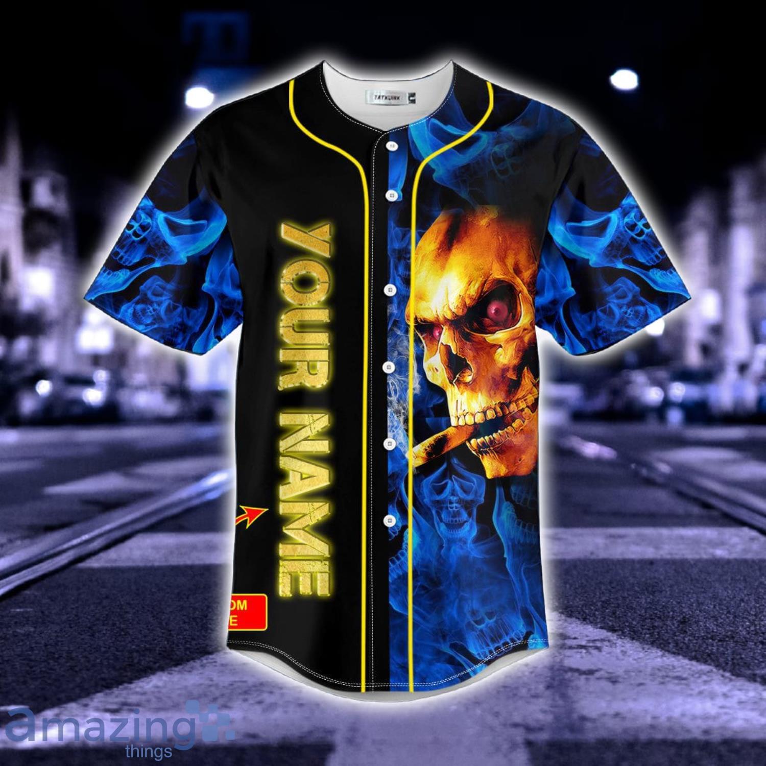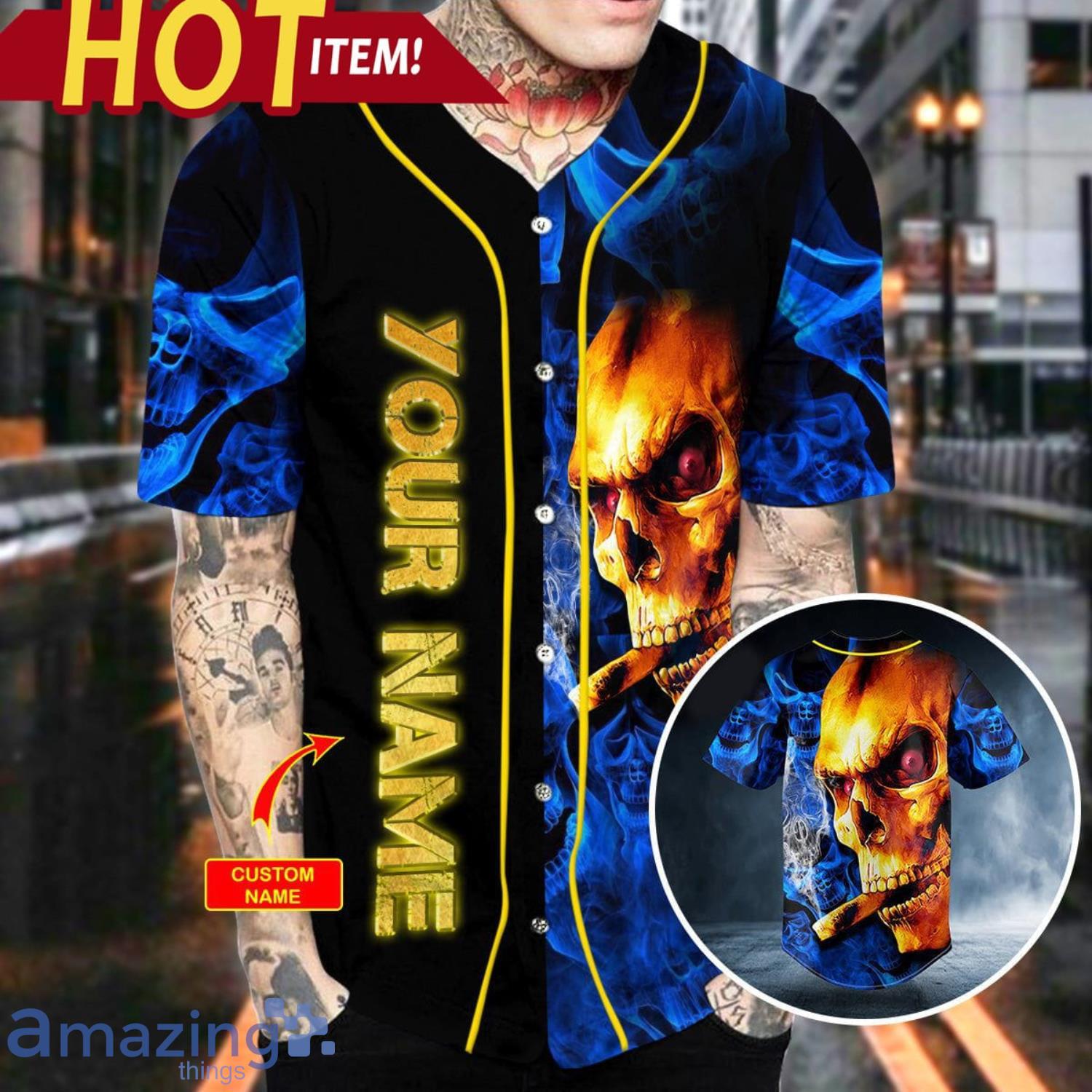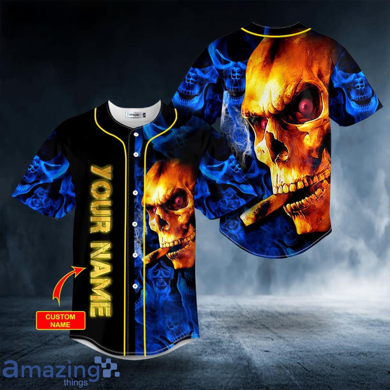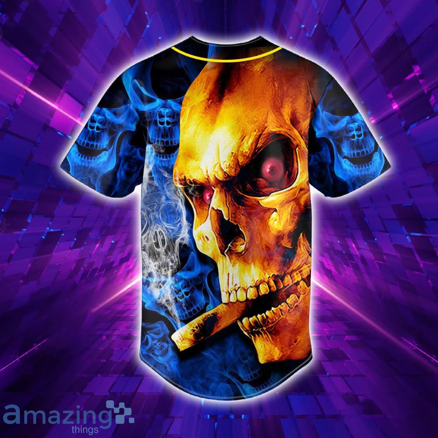 Some of the Golden Smoking Blue Smoke Skull Custom Name All Over Print Baseball Jersey Shirt photos