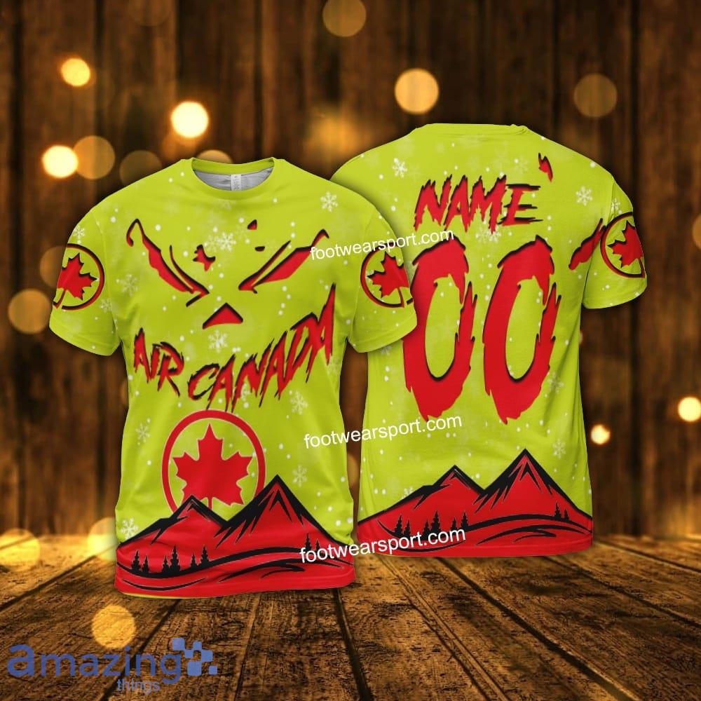 Perfect design for holiday. Get yours this shirt or this is a cute item for your daddy, gift for your mom, and gift for friends on any occasion. buy a cute Grinch Face Air Canada Christmas 3D Hoodie AOP Sweater For Fans Custom Number And Name now.