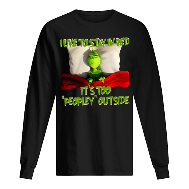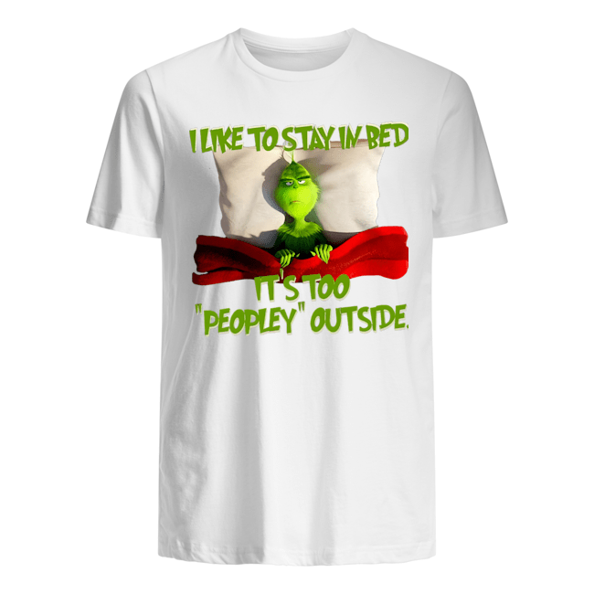 Are you a fan of the festive yet slightly cynical character, the Grinch? Do you often find yourself echoing his sentiment about the world outside? Then the “Grinch I Like To Stay In Bed It’s Too Peopley Outside Shirt” is designed just for you. This unique piece of apparel perfectly captures that relatable feeling of preferring the comfort of your own space over navigating crowded streets and social gatherings.